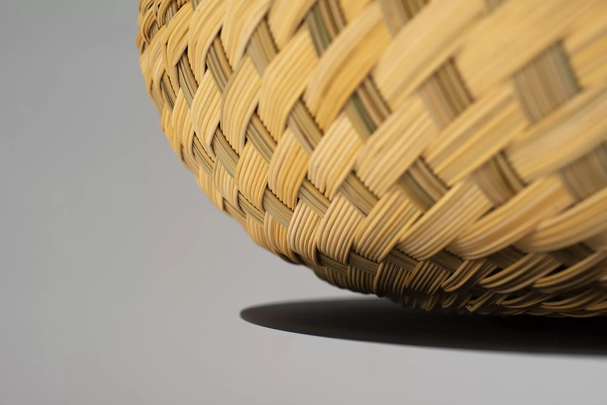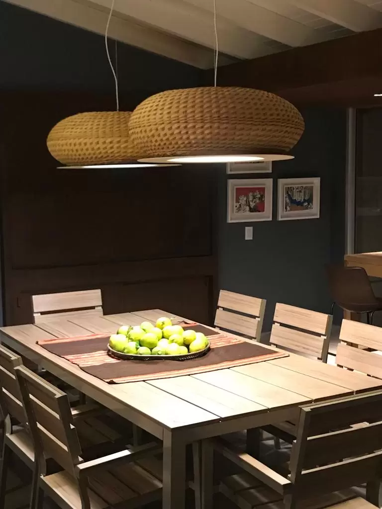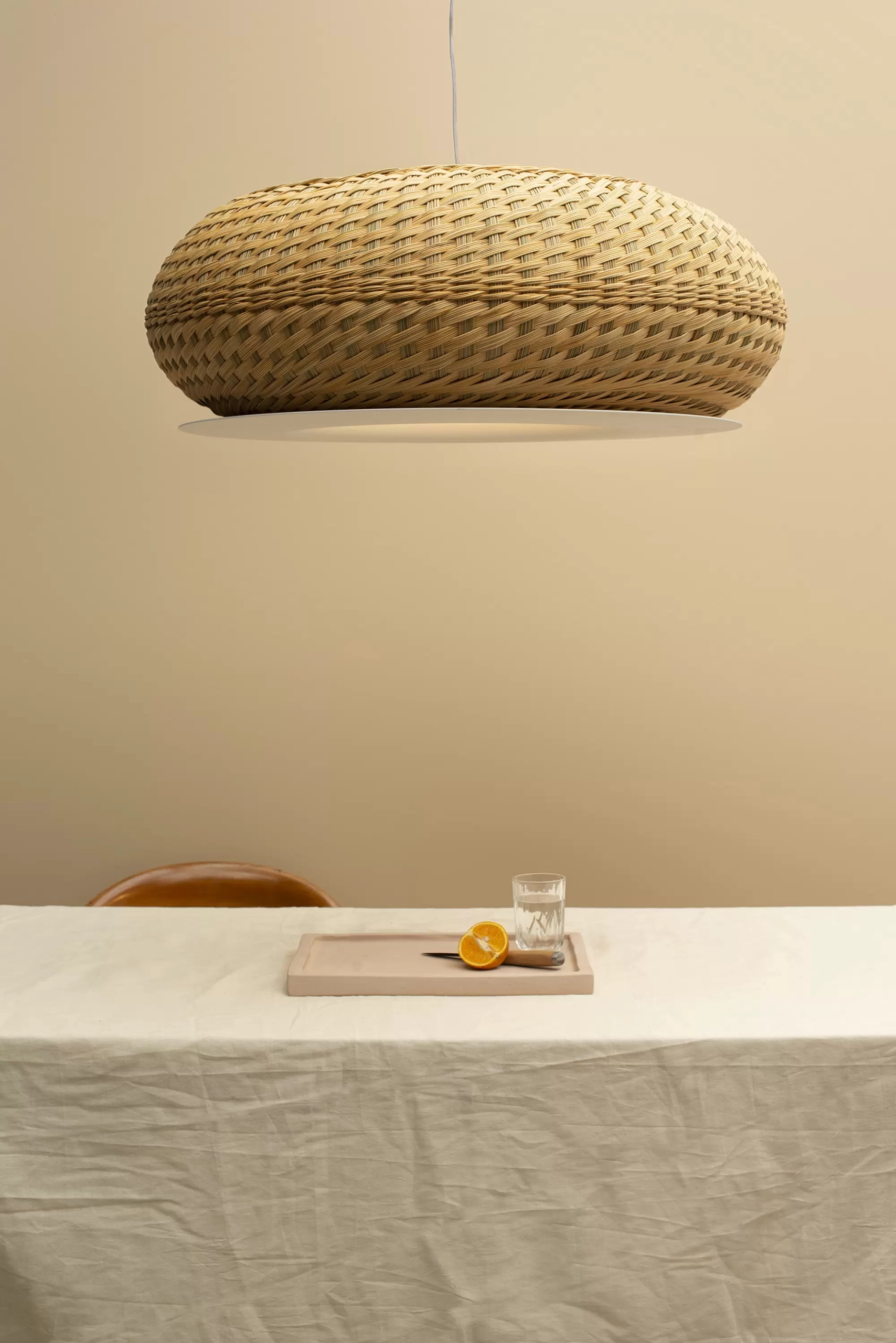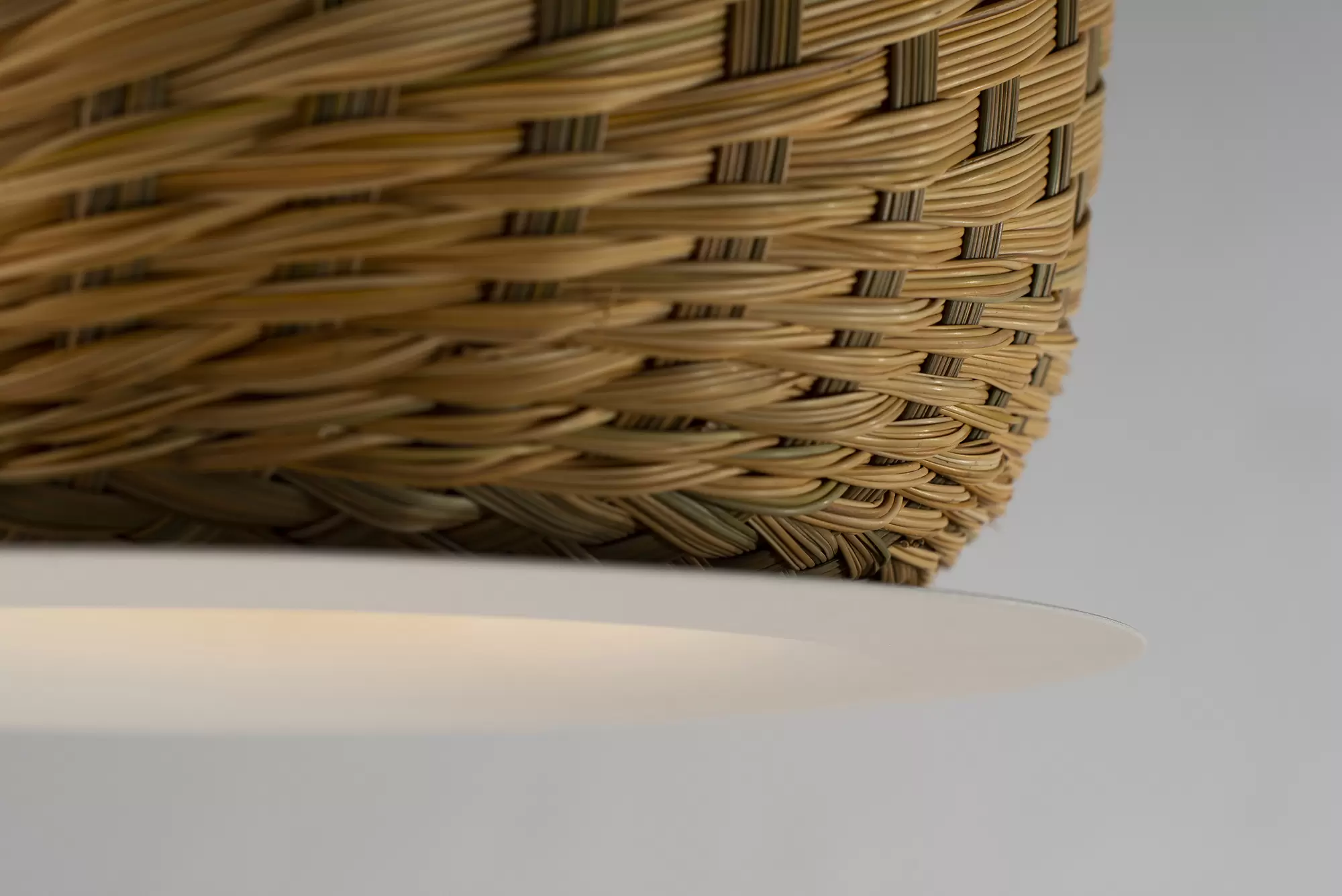 Lámpara de suspensión de luz semi directa. Cuerpo en tejido de fibra natural “simbol” hecho a mano y disco de aluminio. Tensores de acero galvanizado y cable blanco o negro.