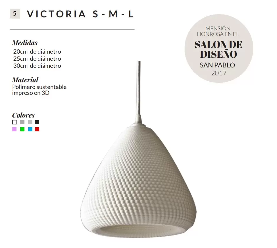 El colgante Victoria es una lámpara fabricada en impresión 3D de estilo moderno, disponible en varios tamaños y colores. Tiene un diseño sencillo pero único, lo que le da originalidad a cada ambiente en el que esté situada. Victoria viene disponible en blanco, negro, gris claro, gris oscuro y beige en todos sus tamaños. A su vez, las lámparas de hasta 40 cm, también están disponibles en colores tales como rosa, azul, naranja, verde u otros. Consultar por los mismos.