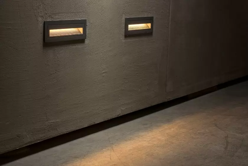 Embutido Brisa H de exterior para empotrar en pared. Luz de señal o circulación simétrica de montaje sencillo con caja porta artefacto. Iluminación de destaque. Estructura construida en aluminio. Difusor de vidrio transparente.