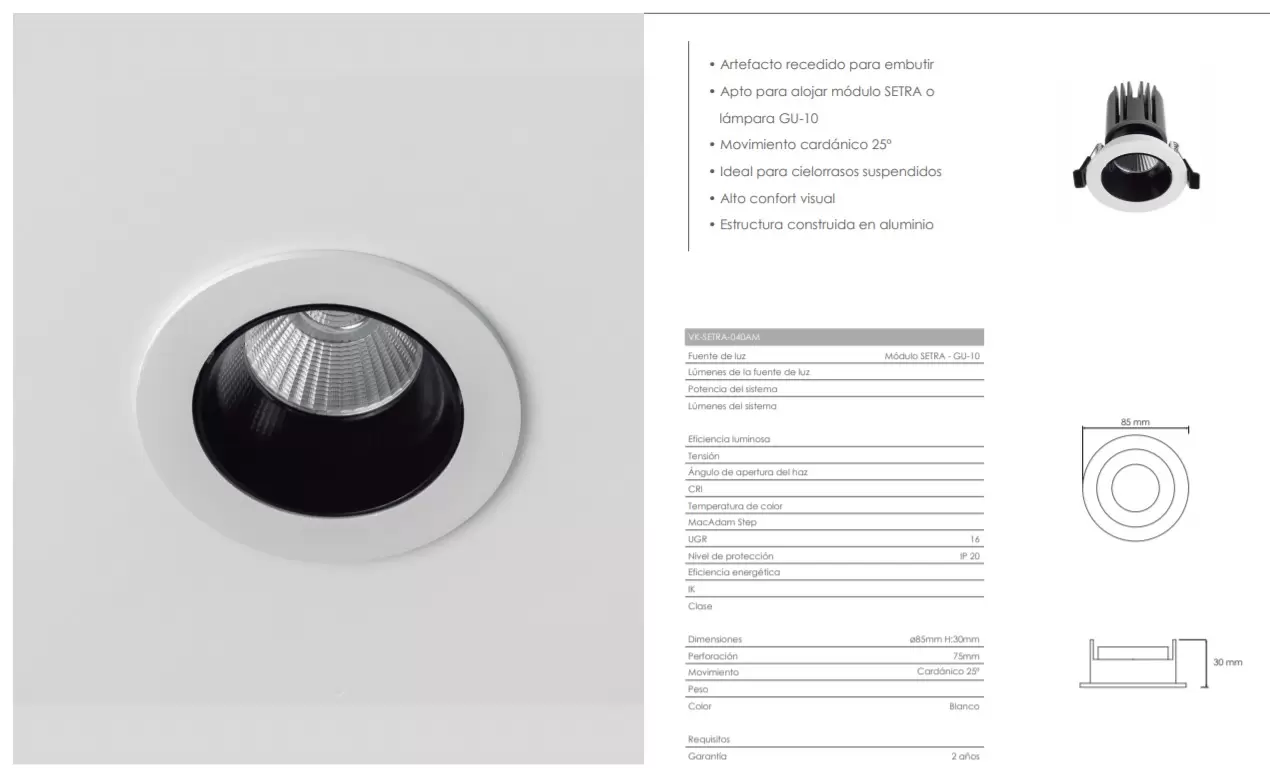 Embutido Setra 40AM apto para alojar módulo SETRA o lámpara GU-10. Movimiento cardánico 25º. Ideal para cielorrasos suspendidos. Alto confort visual. Estructura construida en aluminio.