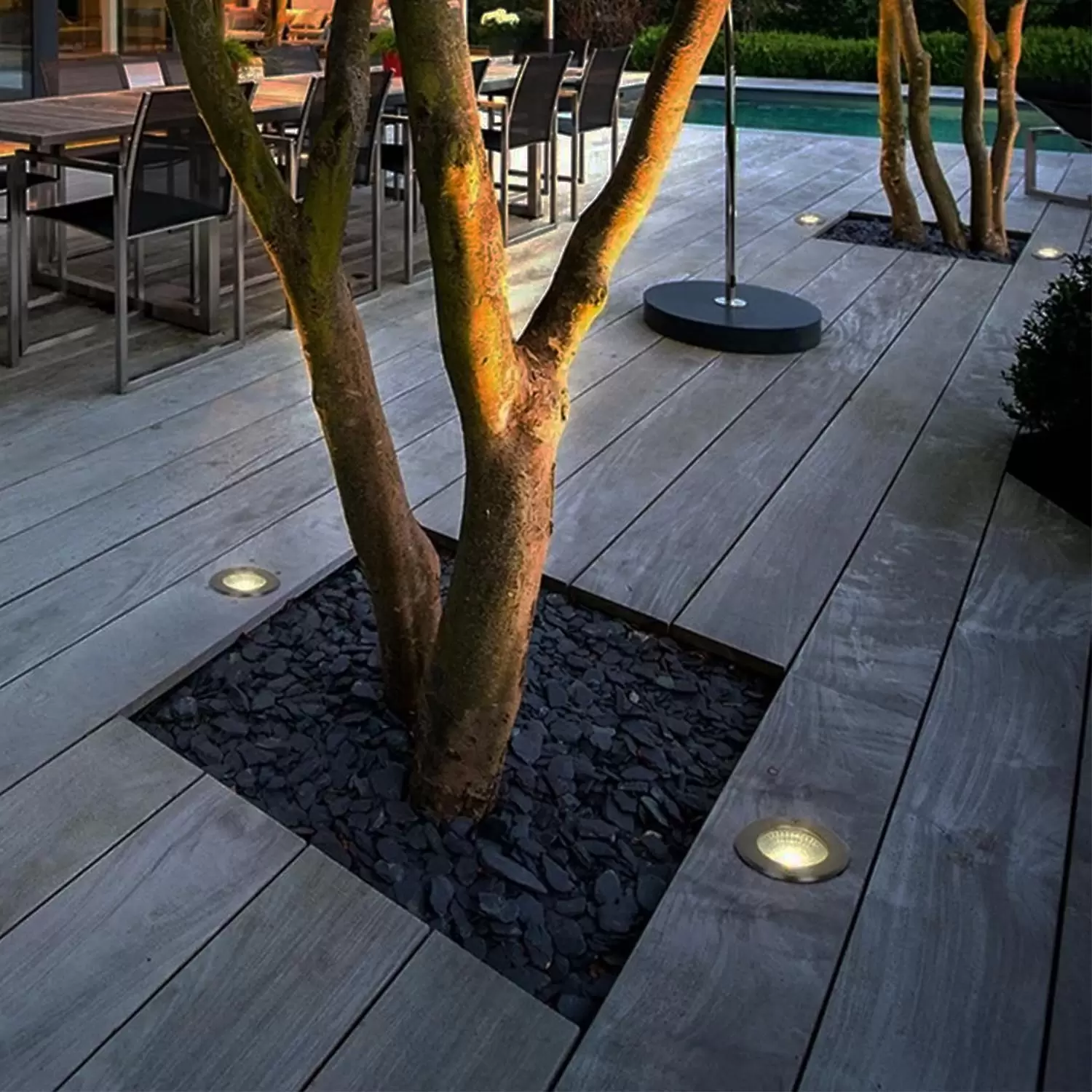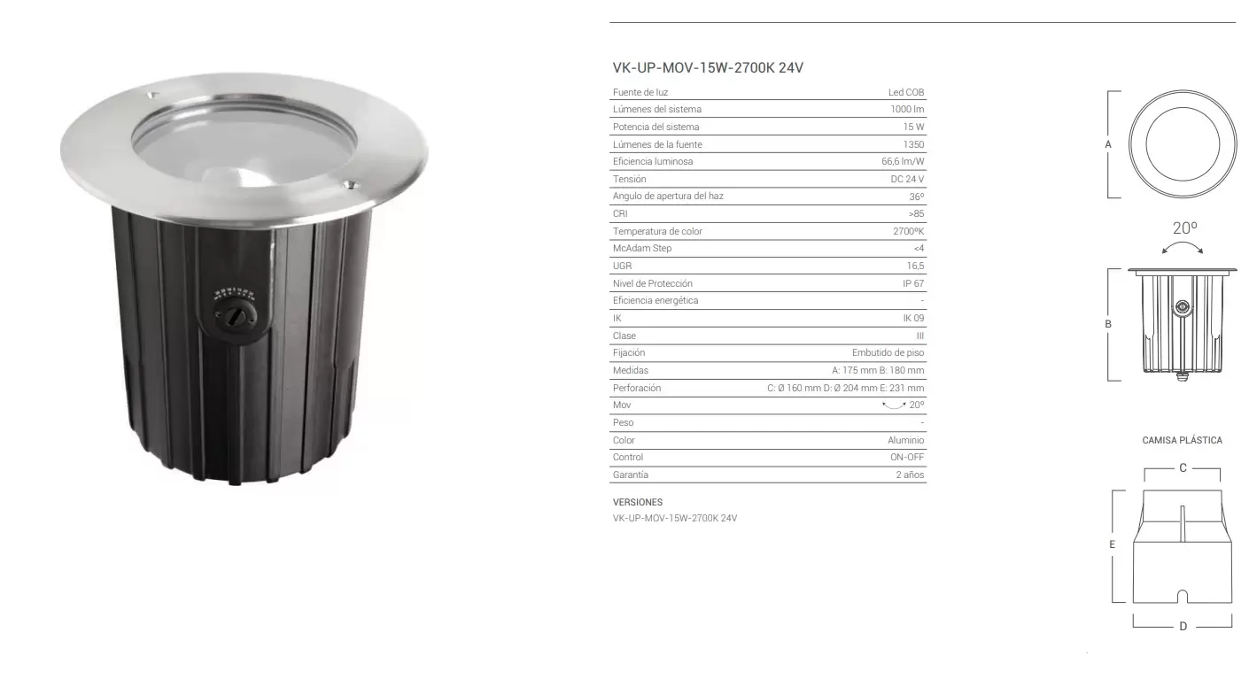 Embutido UP 15. Lámpara de exterior empotrable de piso de diseño compacto, fabricado en cuerpo de aluminio y aro frontal de acero inoxidable. Resistente al polvo y al agua.