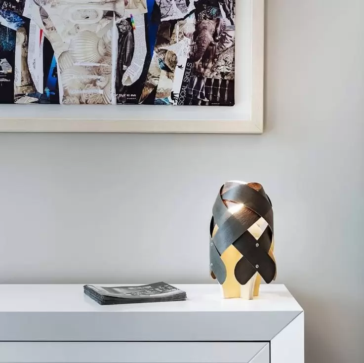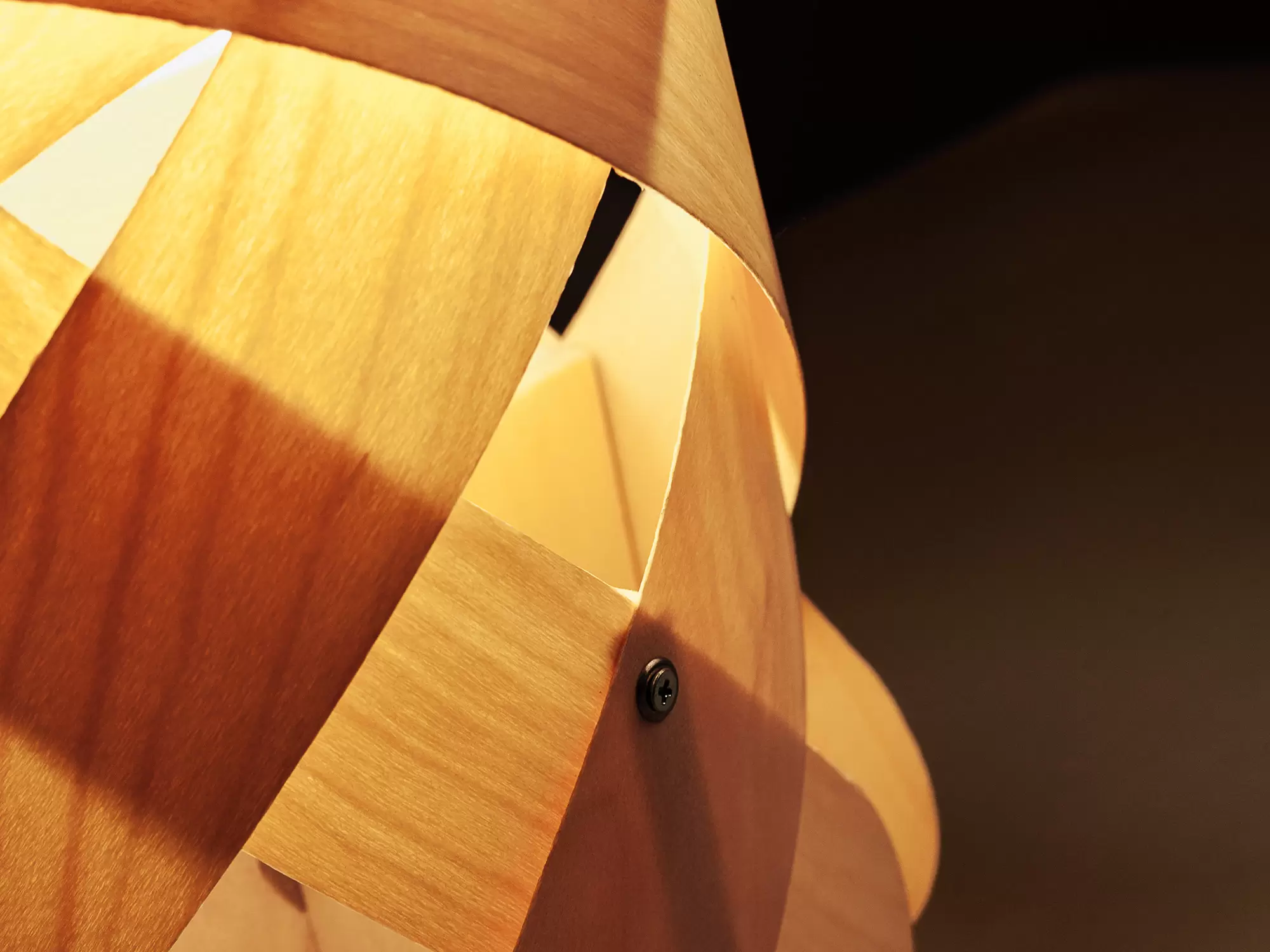 Lámpara de mesa Ananas. Una figura de ananá compuesta de múltiples piezas de chapa de madera. Su entrecruzamiento genera pequeños espacios por donde escapa la luz.