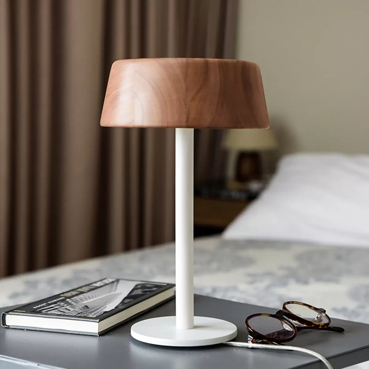 Lampara de mesa Artura es una luminaria de luz directa con LED cálido integrado. Cabezal de madera torneada a mano con base y soporte metálico pintado en blanco.