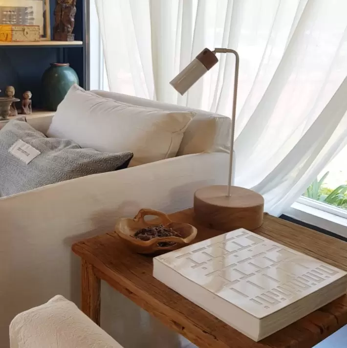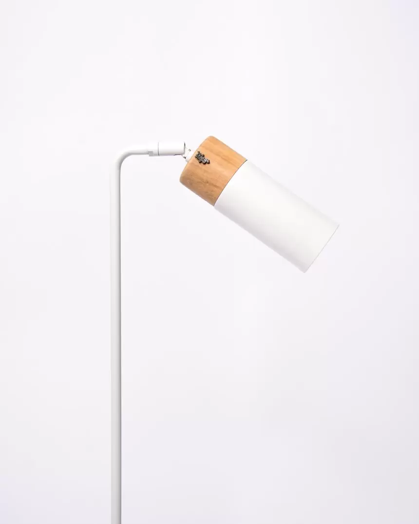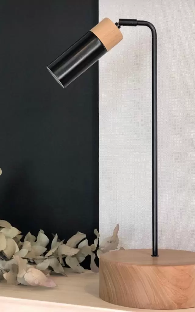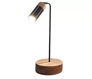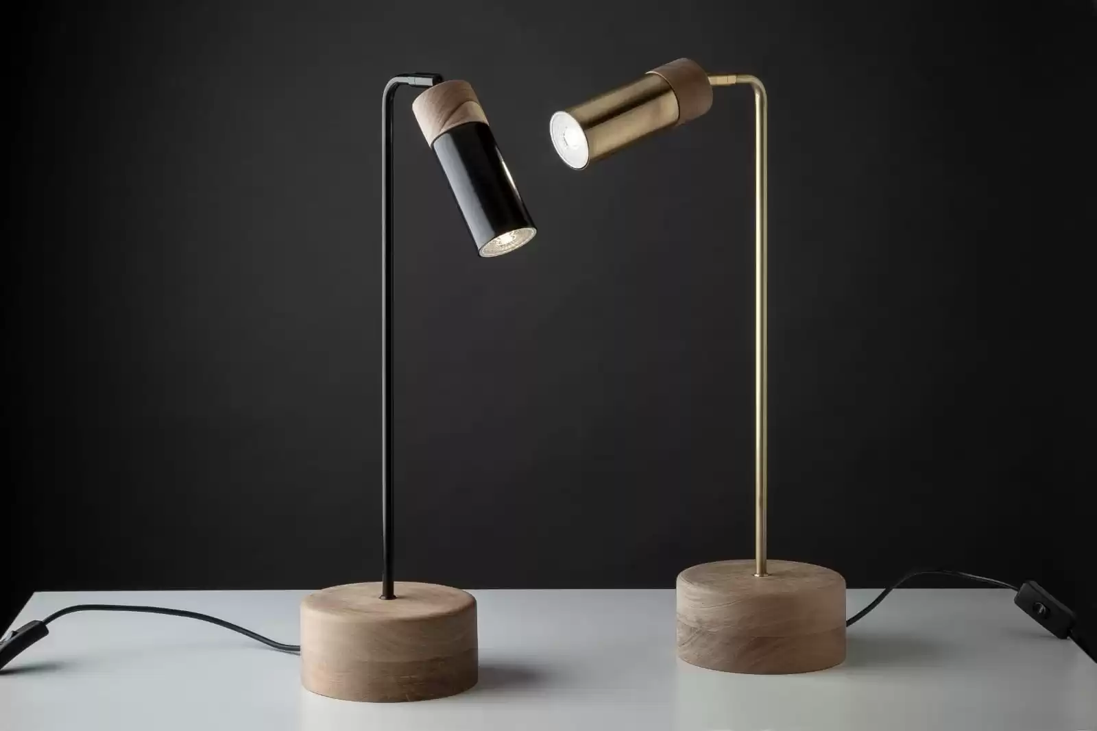 Lampara de mesa Bis esta conformada por un cabezal movil con base y detalles en madera con un cuerpo metálico en color cromo, bronce, cobre, blanco o negro.