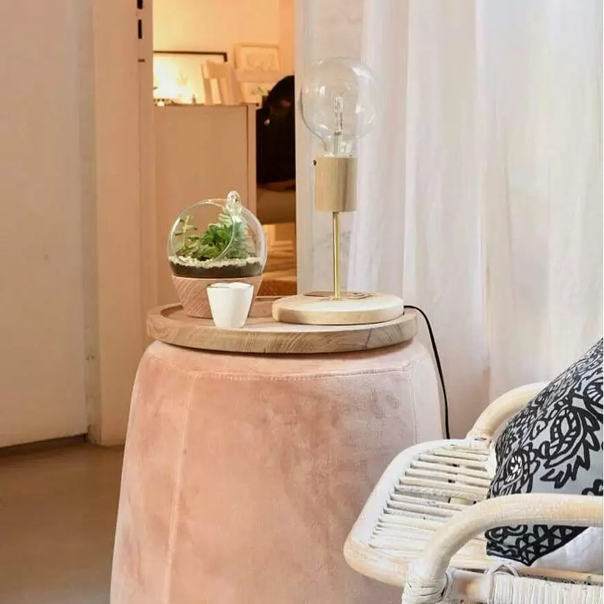 Lampara de mesa Bronx es una luminaria de apoyo construida en madera y metal, la cual puede albergar un foco e-27 led de filamento expuesto