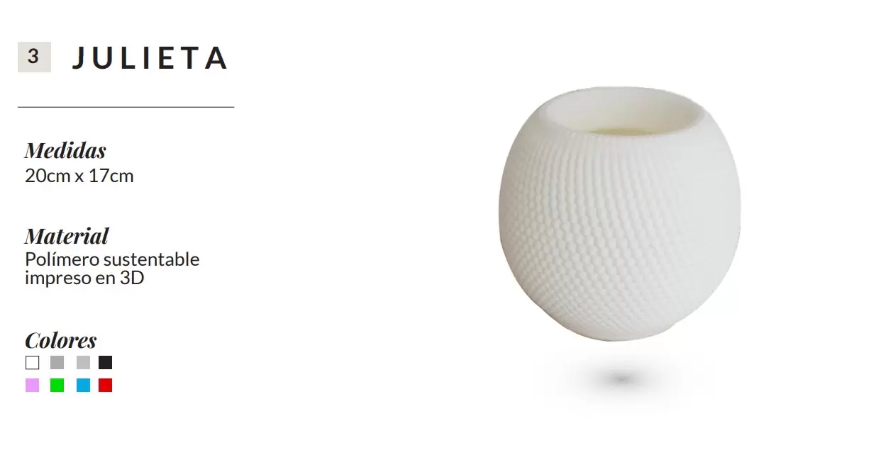 - Material: Polímero biodegradable, derivado del ácido láctico (recurso 100% renovable, impresión 3D)