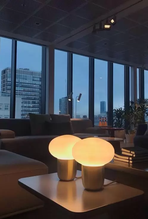 Lampara de mesa Lumuna es una luminaria de apoyo de base color negro, dorado o blanco con tulipa de vidrio opal satinado.