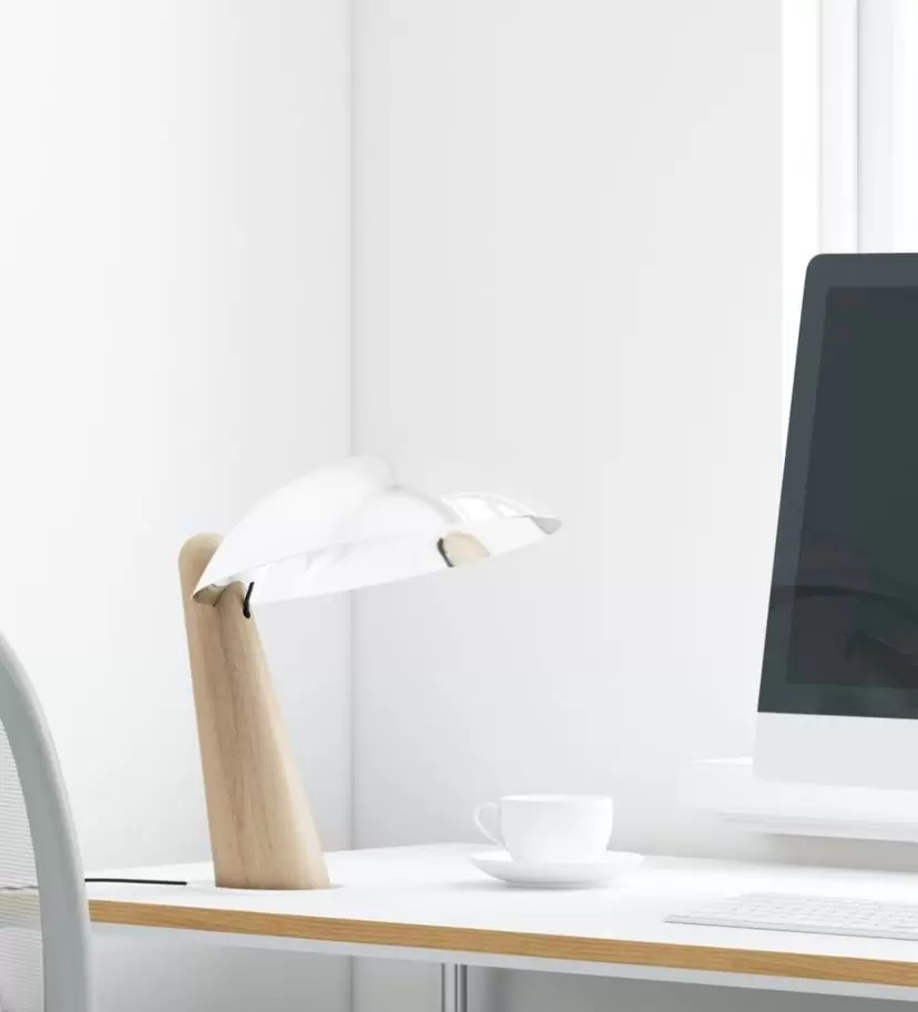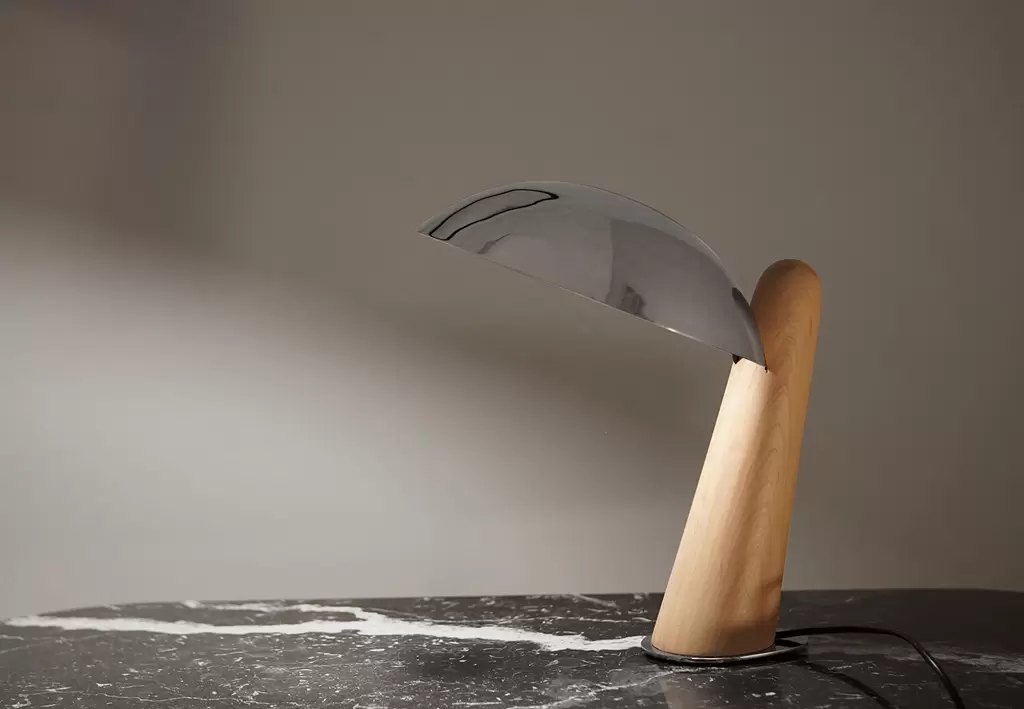 Lampara de mesa Madescu de estilo escandinavo esta disponible en cromo, blanco o negro con la base en madera de lenga. Esta luminaria nace del simple equilibrio entre el acero de su pantalla y la estructura de madera, brindando un lenguaje de diseño simple en una forma creativa. Su diseño es funcional y atemporal, con un profundo conocimiento de los materiales naturales y una especial atención a los detalles.