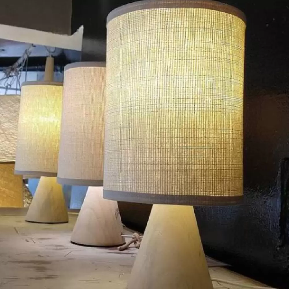 Lámpara de mesa Minicono. Lámpara velador confeccionada artesanalmente. Base de madera Guatambú torneada. Pantalla de tela rígida bicapa.