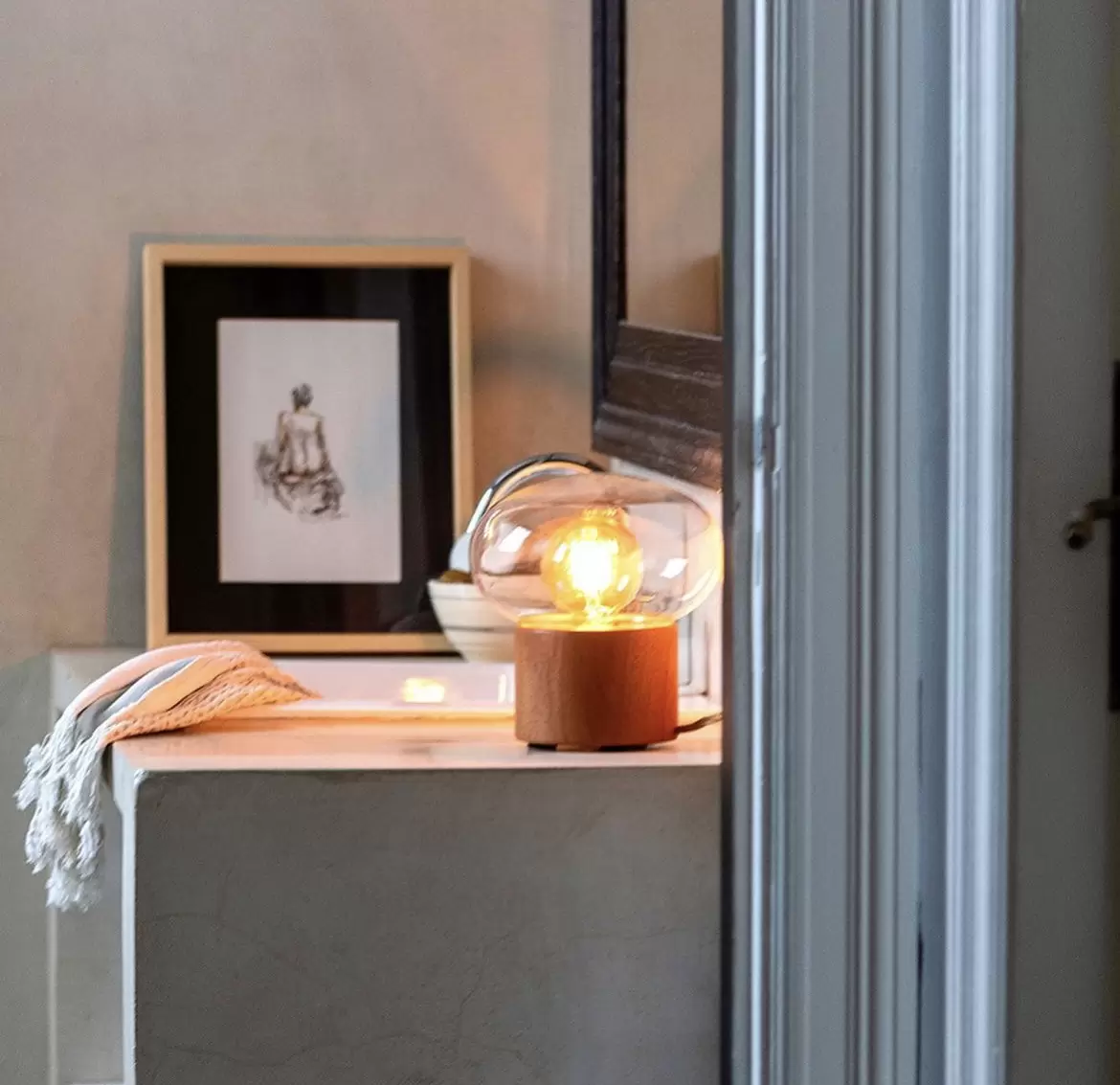Lampara de mesa Namu es una luminaria de estilo vintage con base de madera y tulipa de vidrio transparente