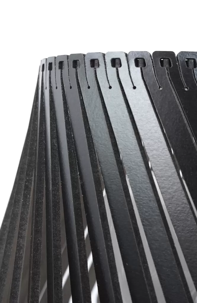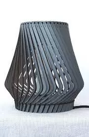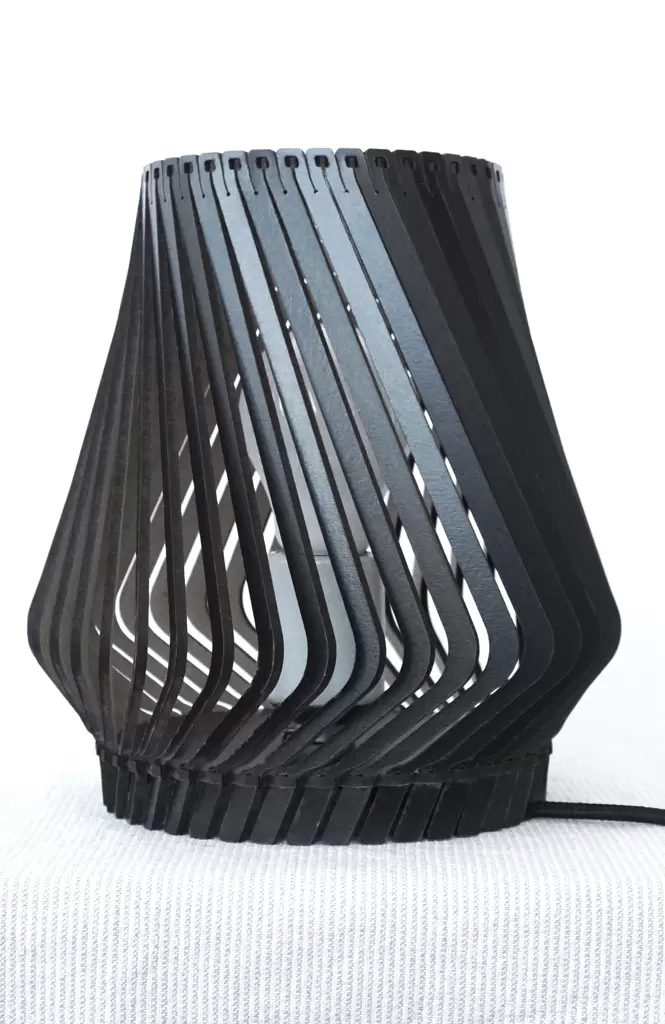 Lámpara de mesa Salamanca constituida por la superposición de finas placas de madera. Disponible en blanco, negro o gris.