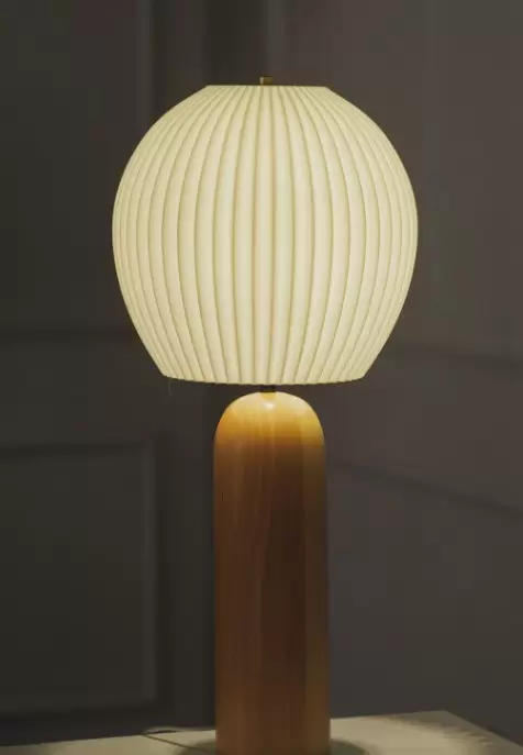 Lampara de Mesa Serena es una luminaria de escritorio con base de madera y pantalla de impresión 3D. Viene en color bronce.