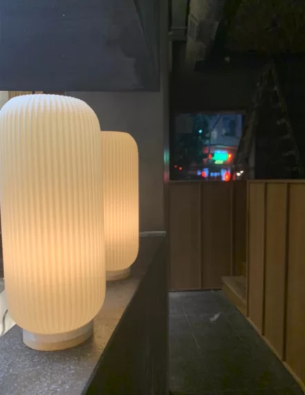 Lámpara de mesa Teresa. Luminaria de estilo modelo/nórdico fabricada en impresión 3D con detalles en madera, disponible en dos tamaños: small y large y cinco colores: blanco, beige, gris claro, gris oscuro y negro.