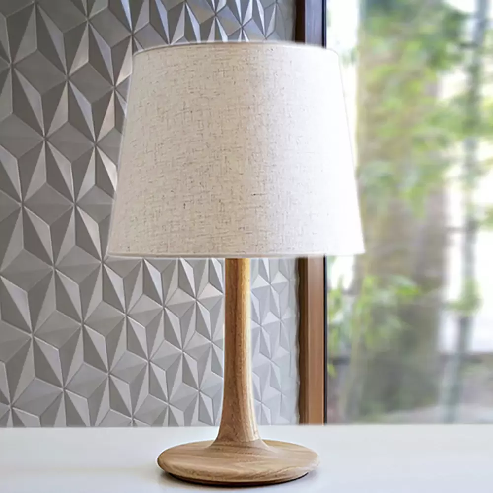 Lampara de mesa Trini es una luminaria de apoyo con base de madera torneada a mano en color natural o negra satinada con pantalla de tela gross negro, lino natural o yute.