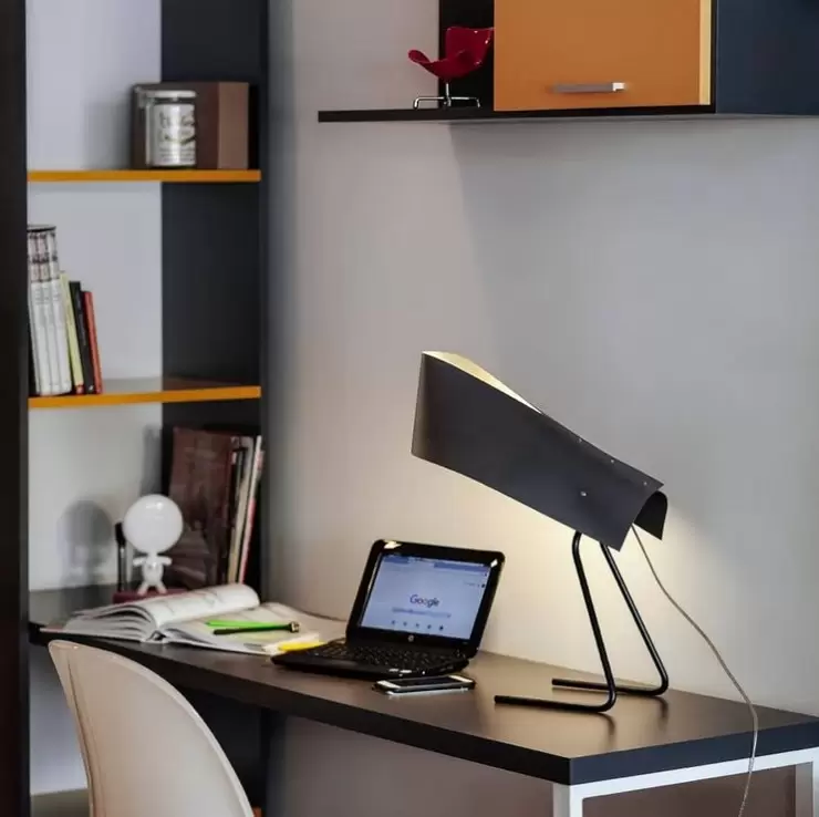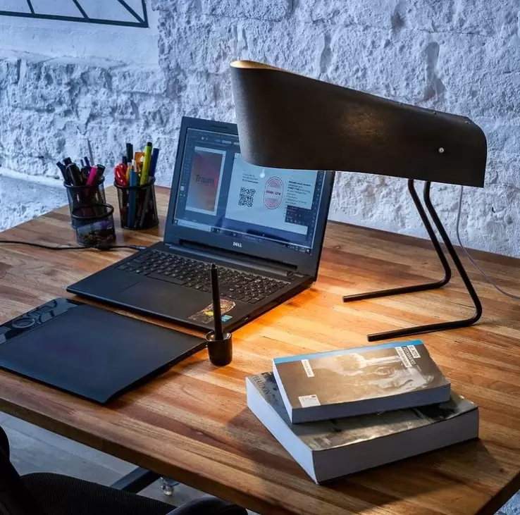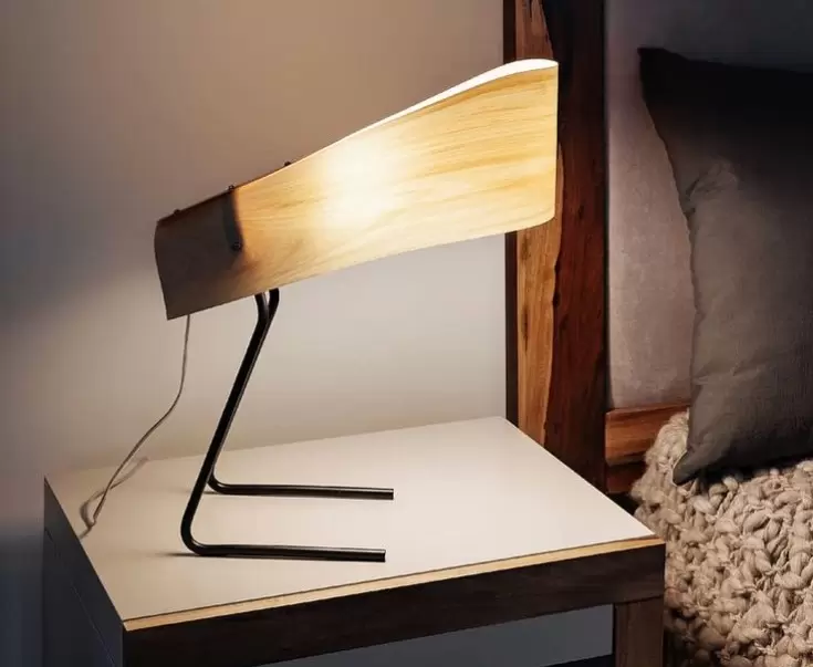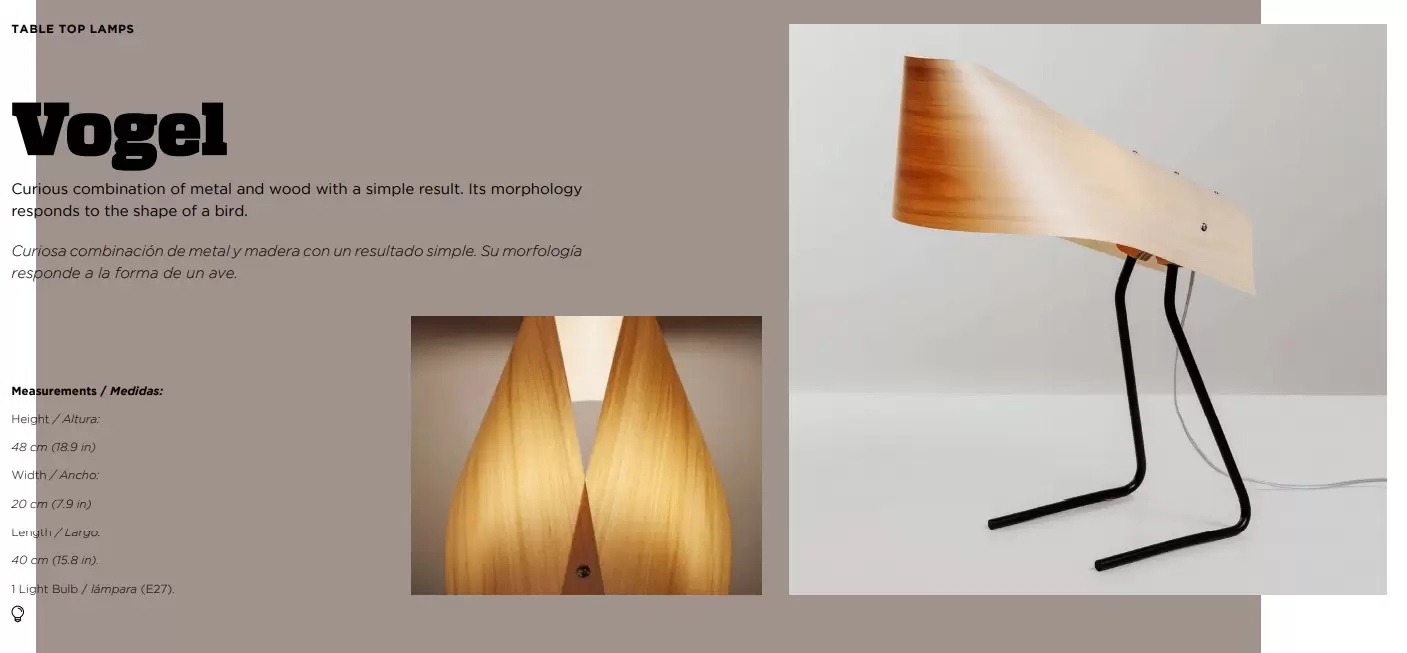 Lámpara de mesa Vogel. Curiosa combinación de metal y madera con un resultado simple. En esta lámpara, su morfología responde a la forma de un ave.