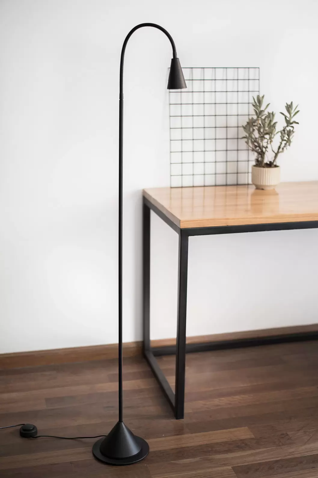 Lampara de pie Felxi es una luminaria de 140cm de alto disponible en color blanco o negro integro con LED integrado y brazo flexible.