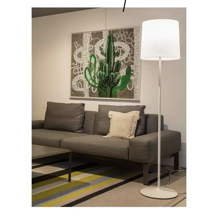 Lámpara de pie Hihat grande traslúcida realizada en aluminio tanto su soporte como su base con una pantalla para tres lámparas LED totalmente traslúcida. Ideal para ambientar livings o espacios modernos de interior.