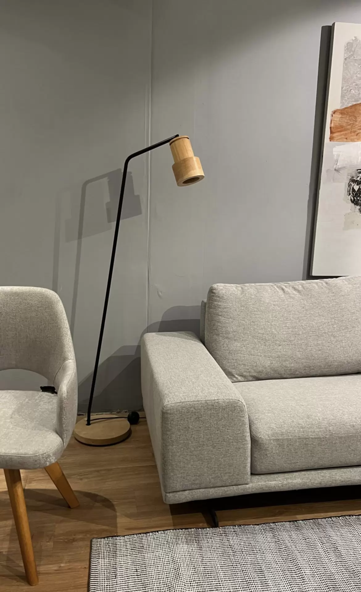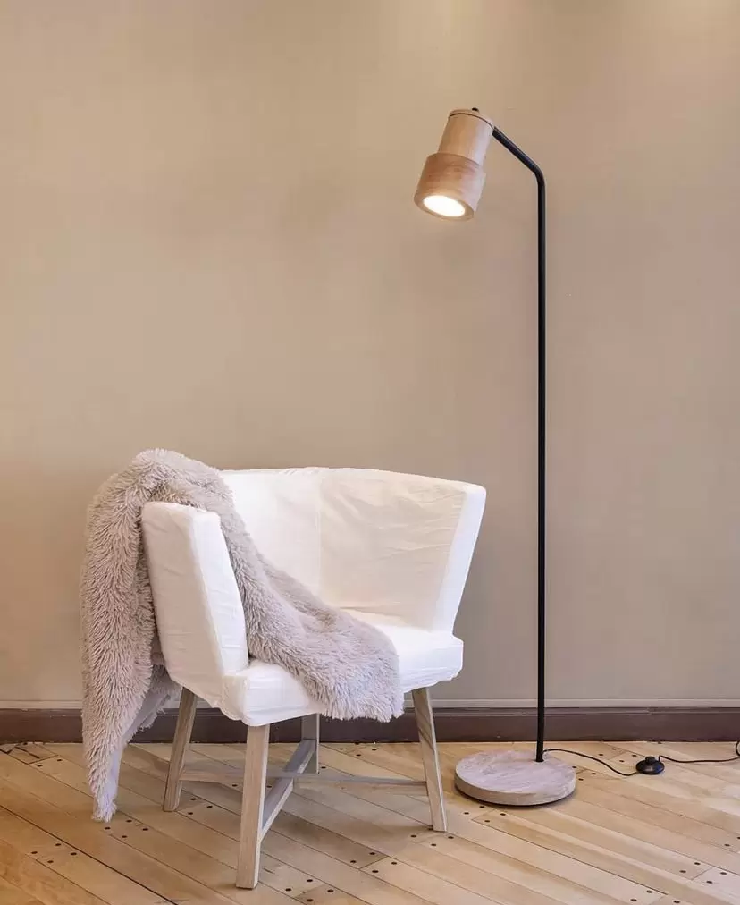 Lampara de pie Jazz posee una estructura de hierro con base y cabezal de madera de lenga torneada.