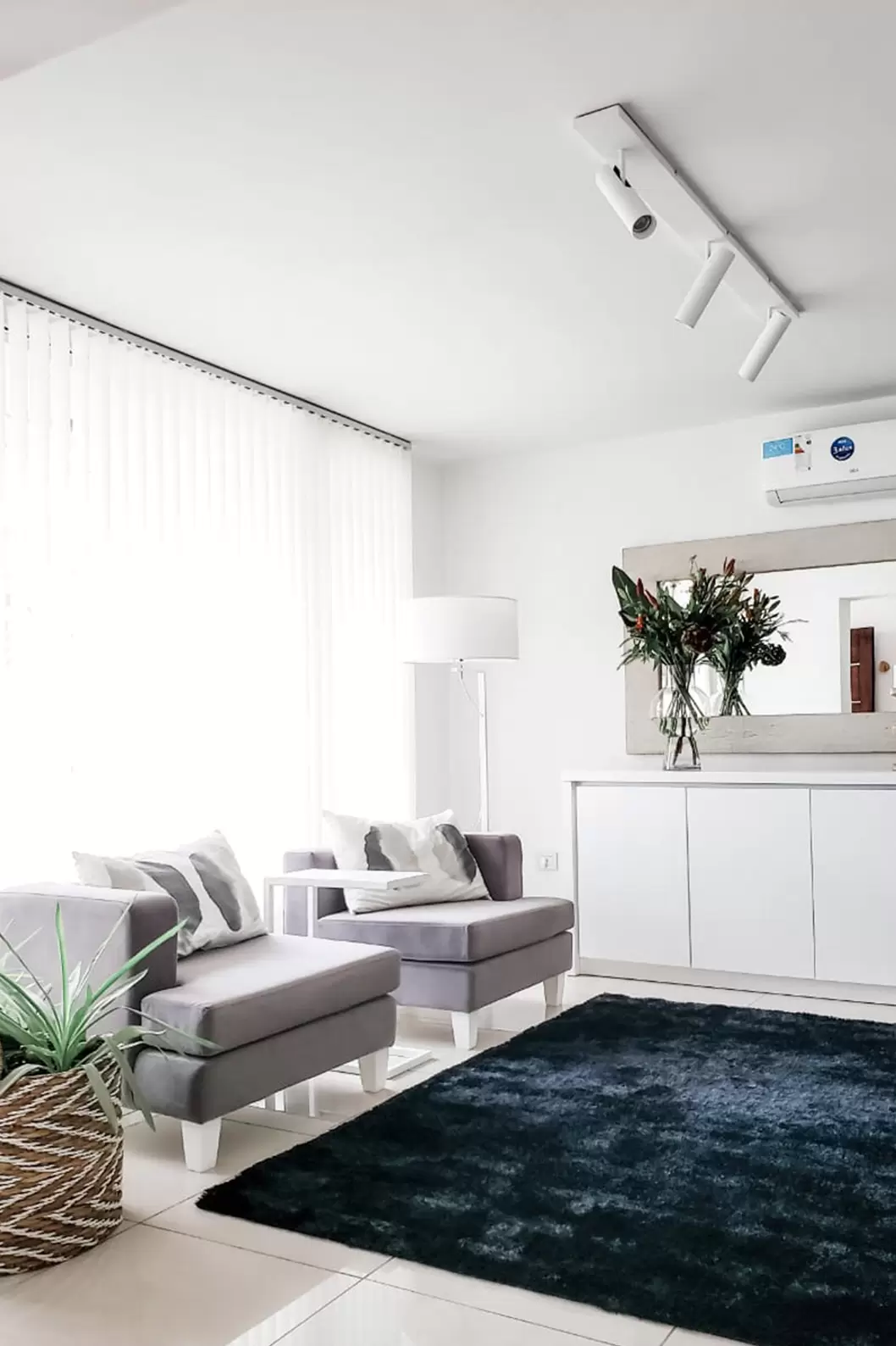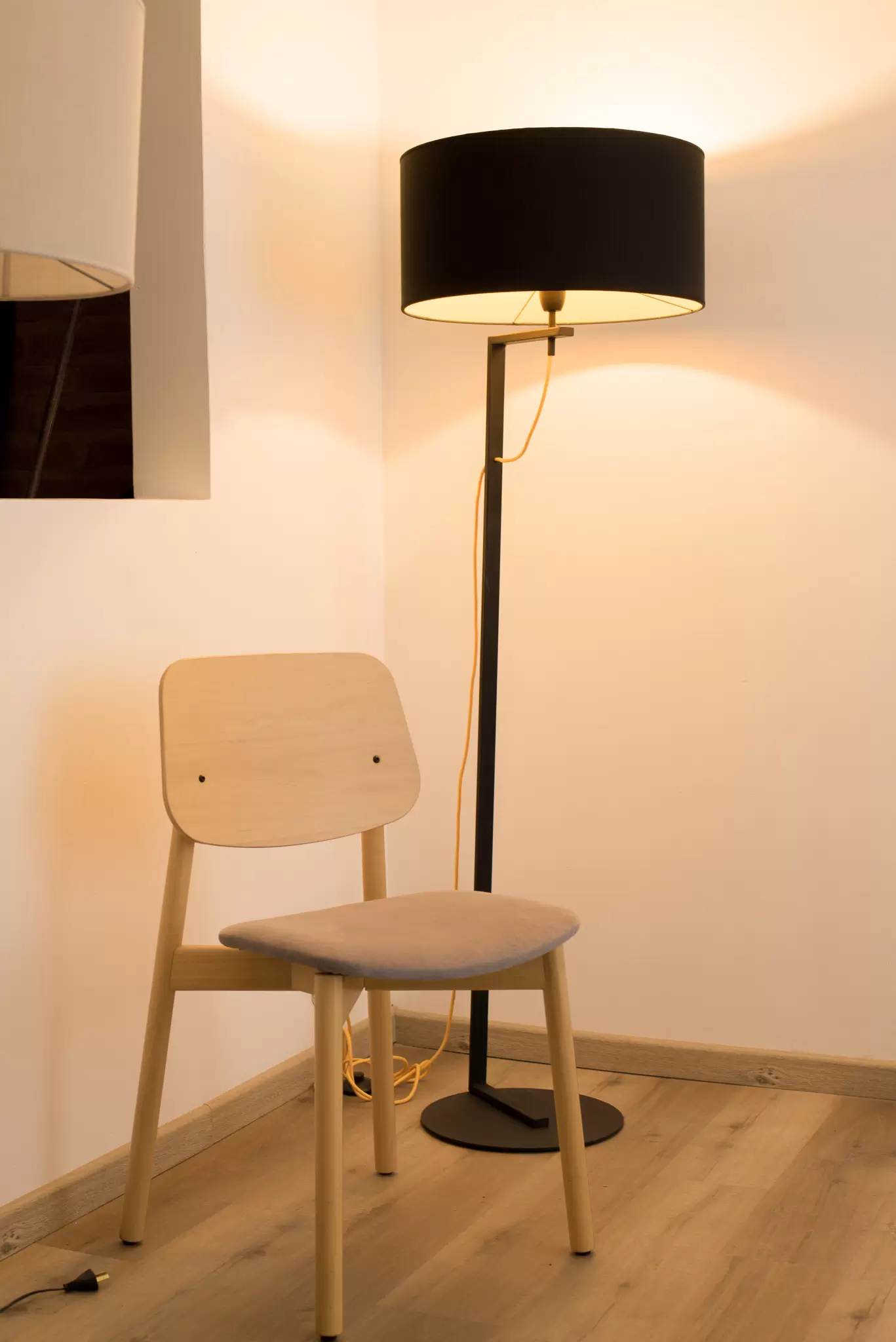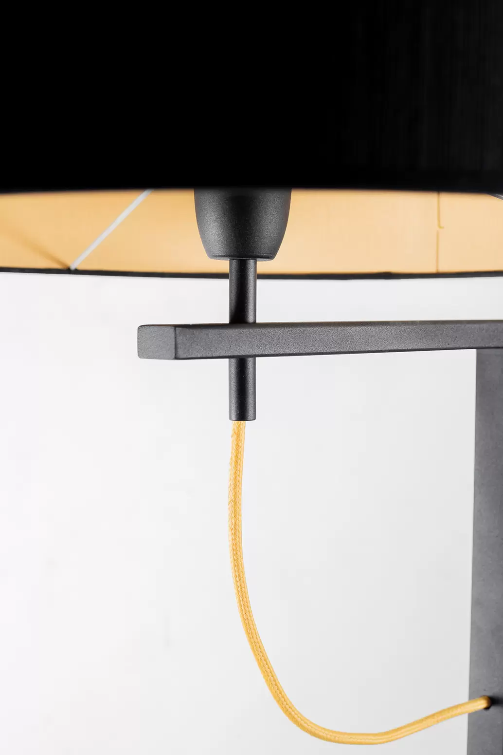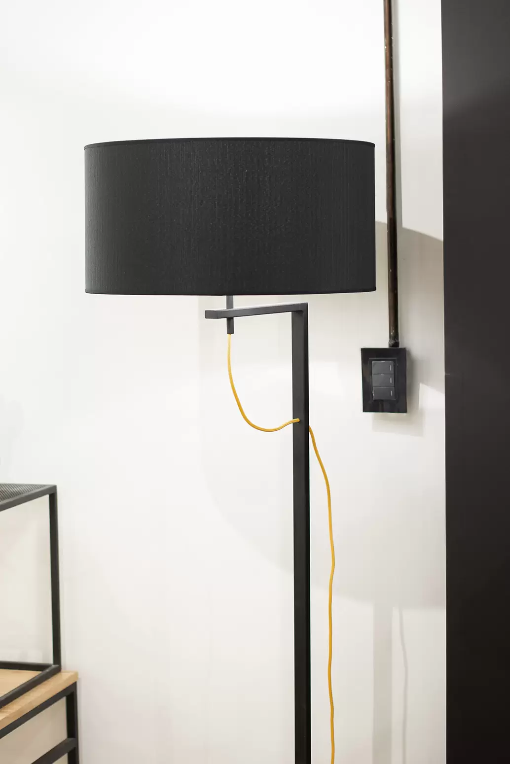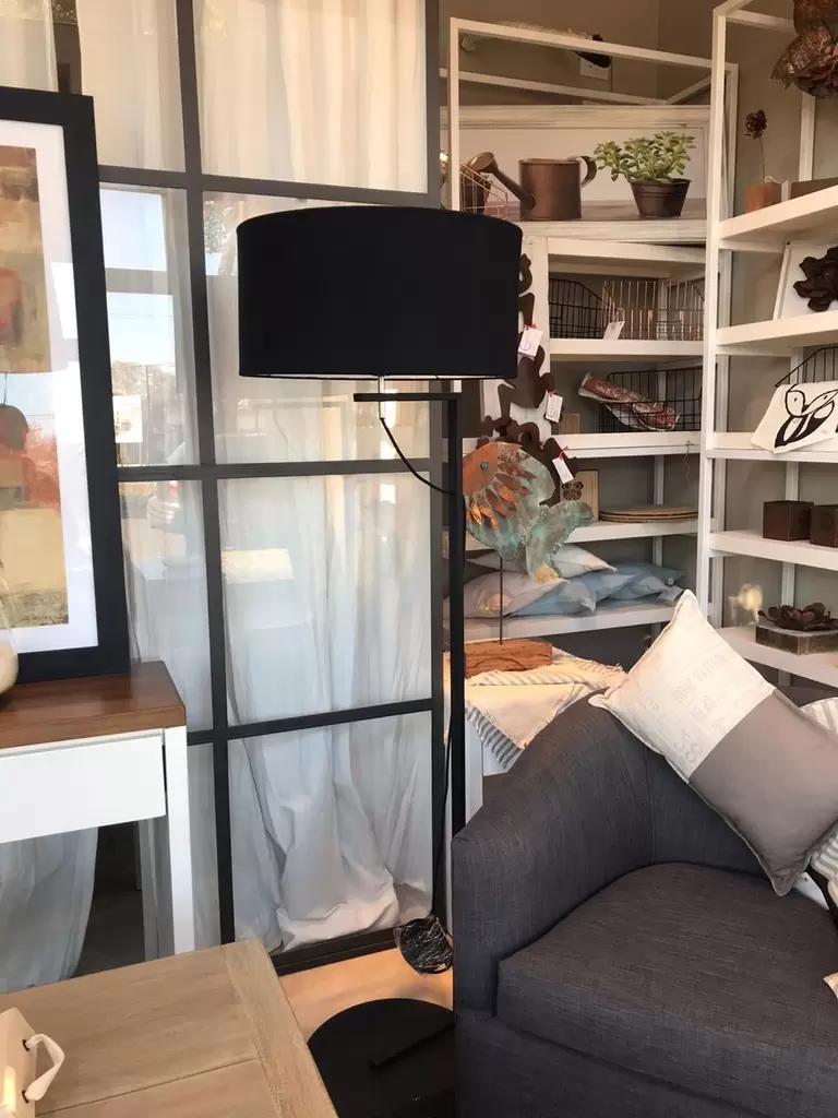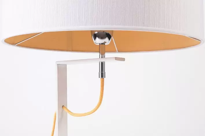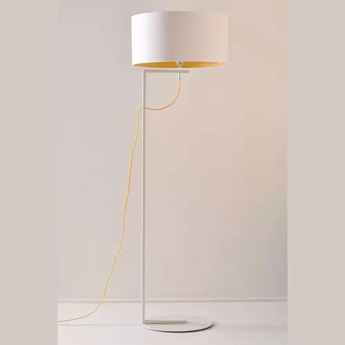 Lampara de pie Valencia es una luminaria con base metálica y pantalla de tela Madraz. Disponible en color negro o blanco.