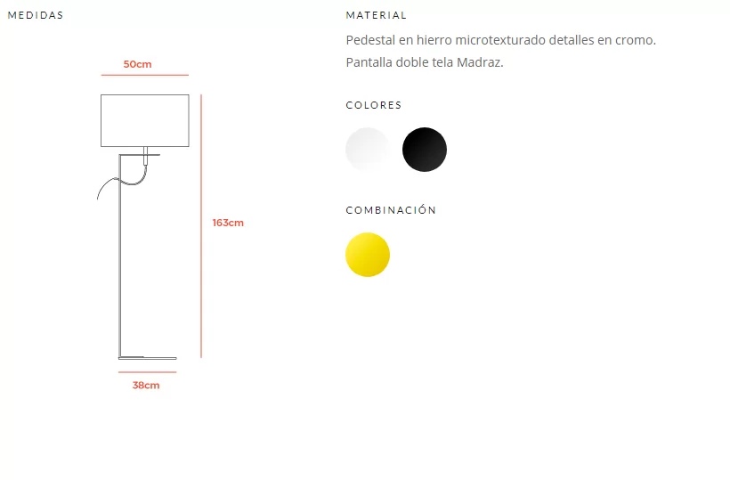 - Material: Pedestal en hierro microtexturado detalles en cromo. Pantalla doble tela Madraz.