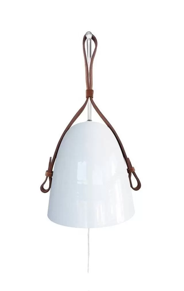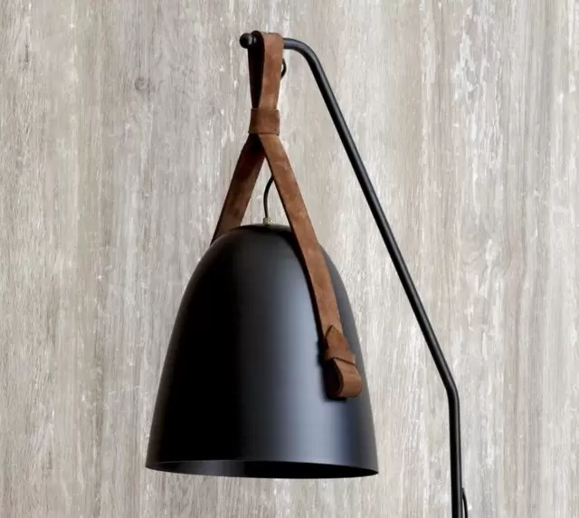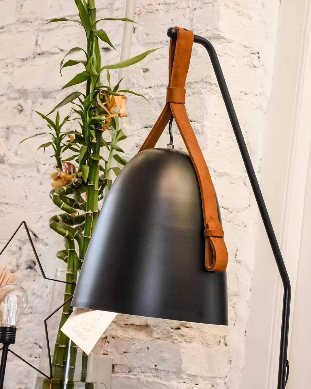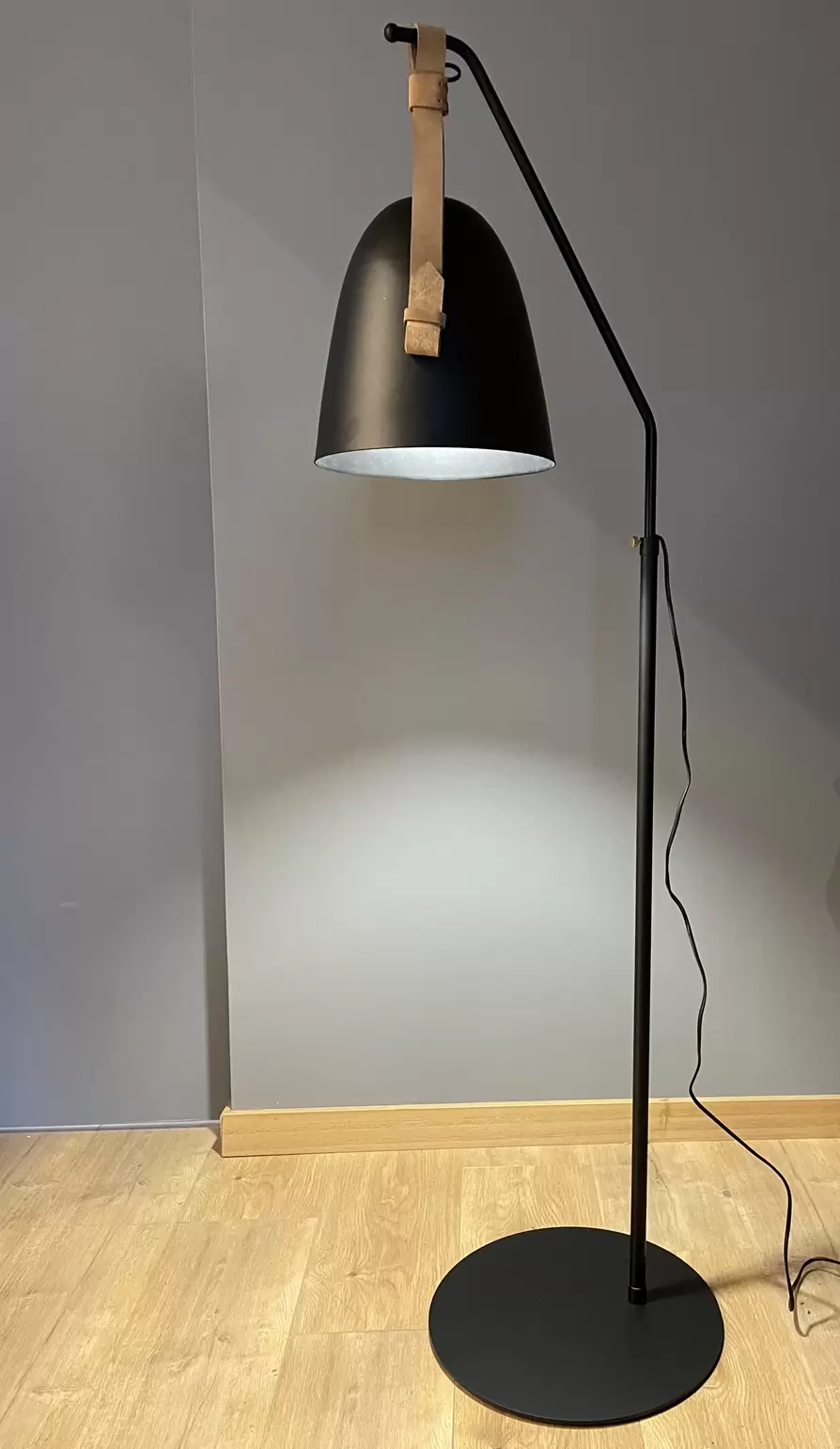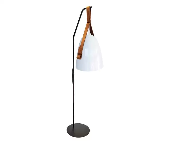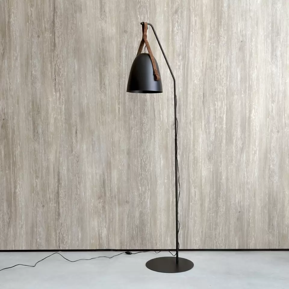 Lampara de pie Viking construida en metal con cabezal suspendido desde un agarra de cuero castaño gamuzado.
