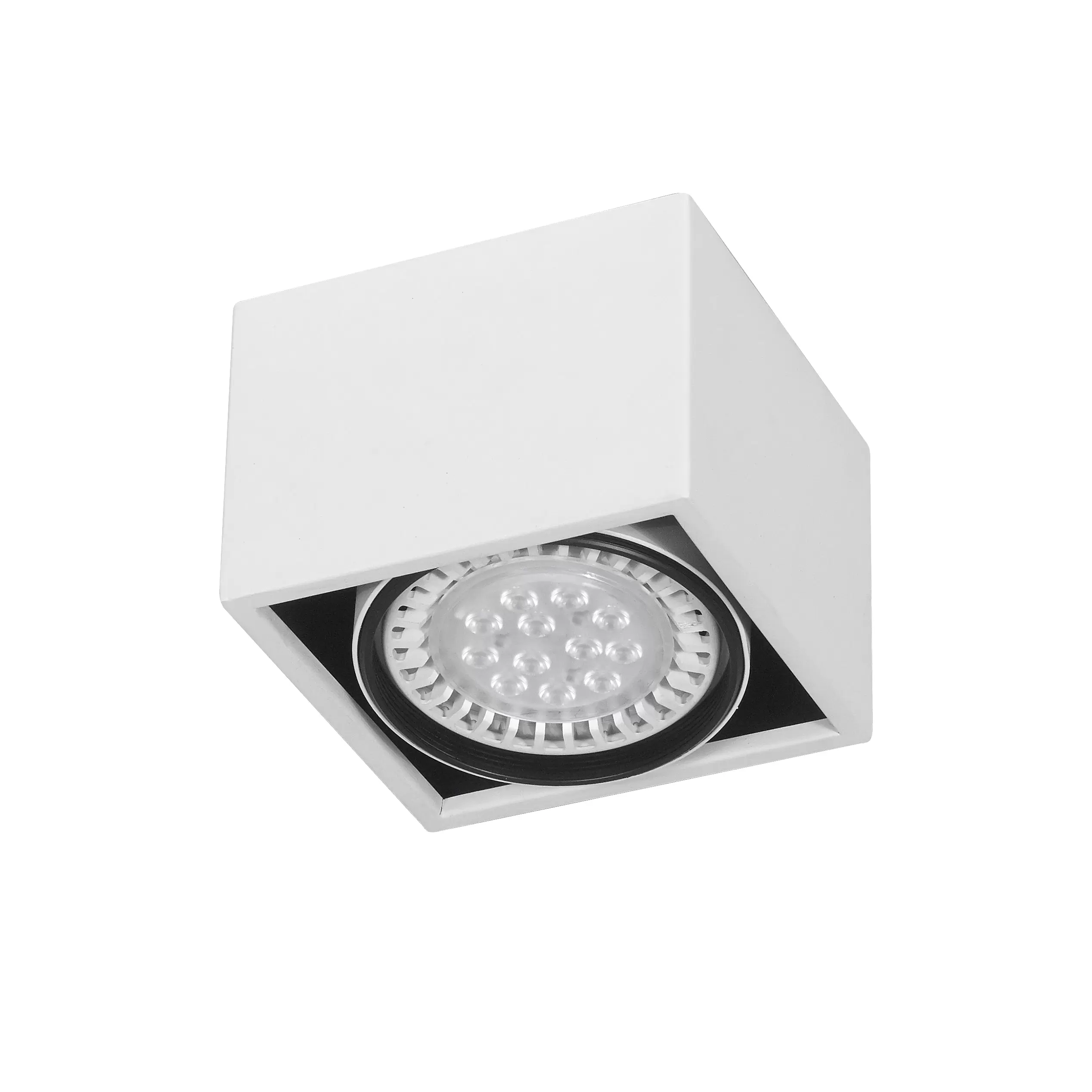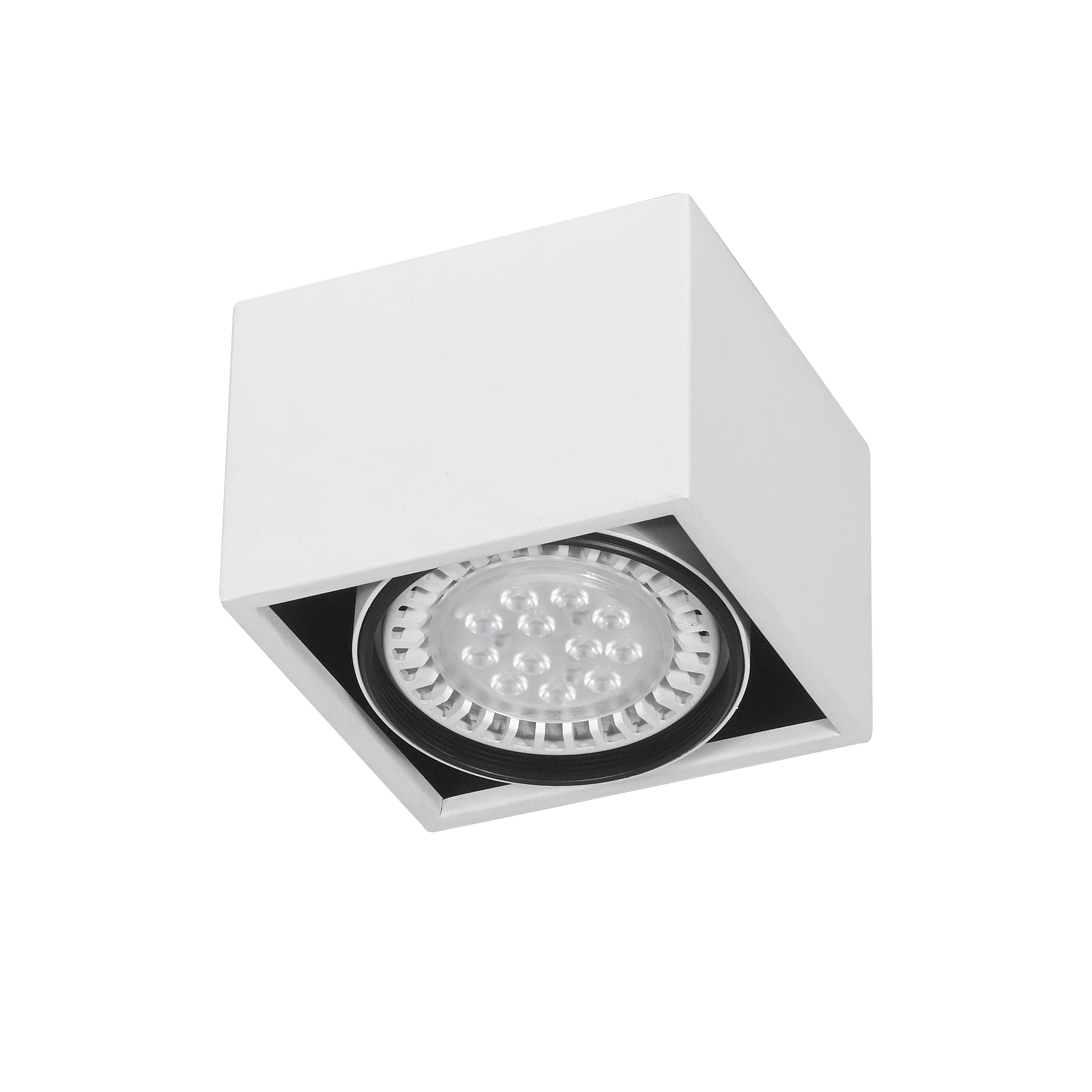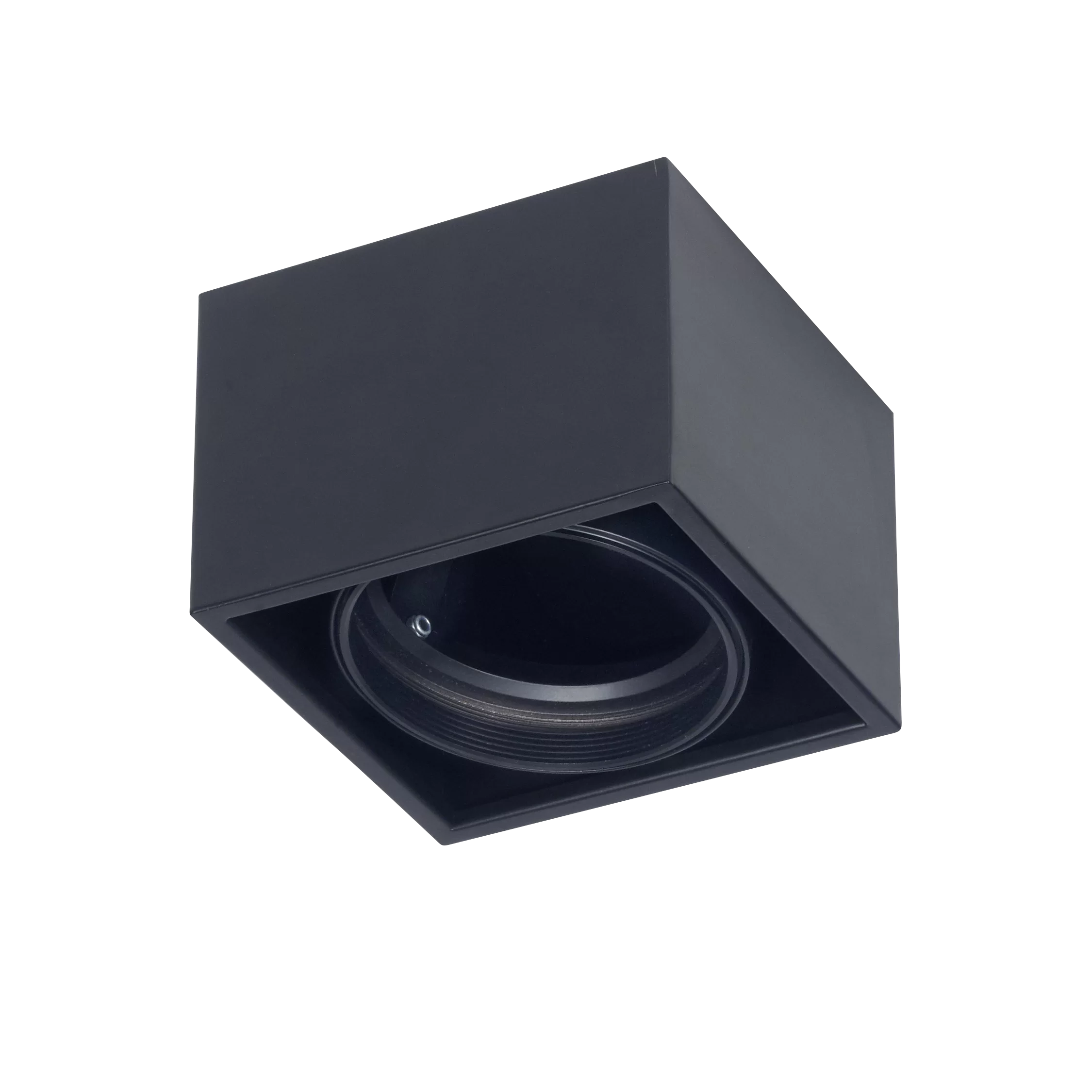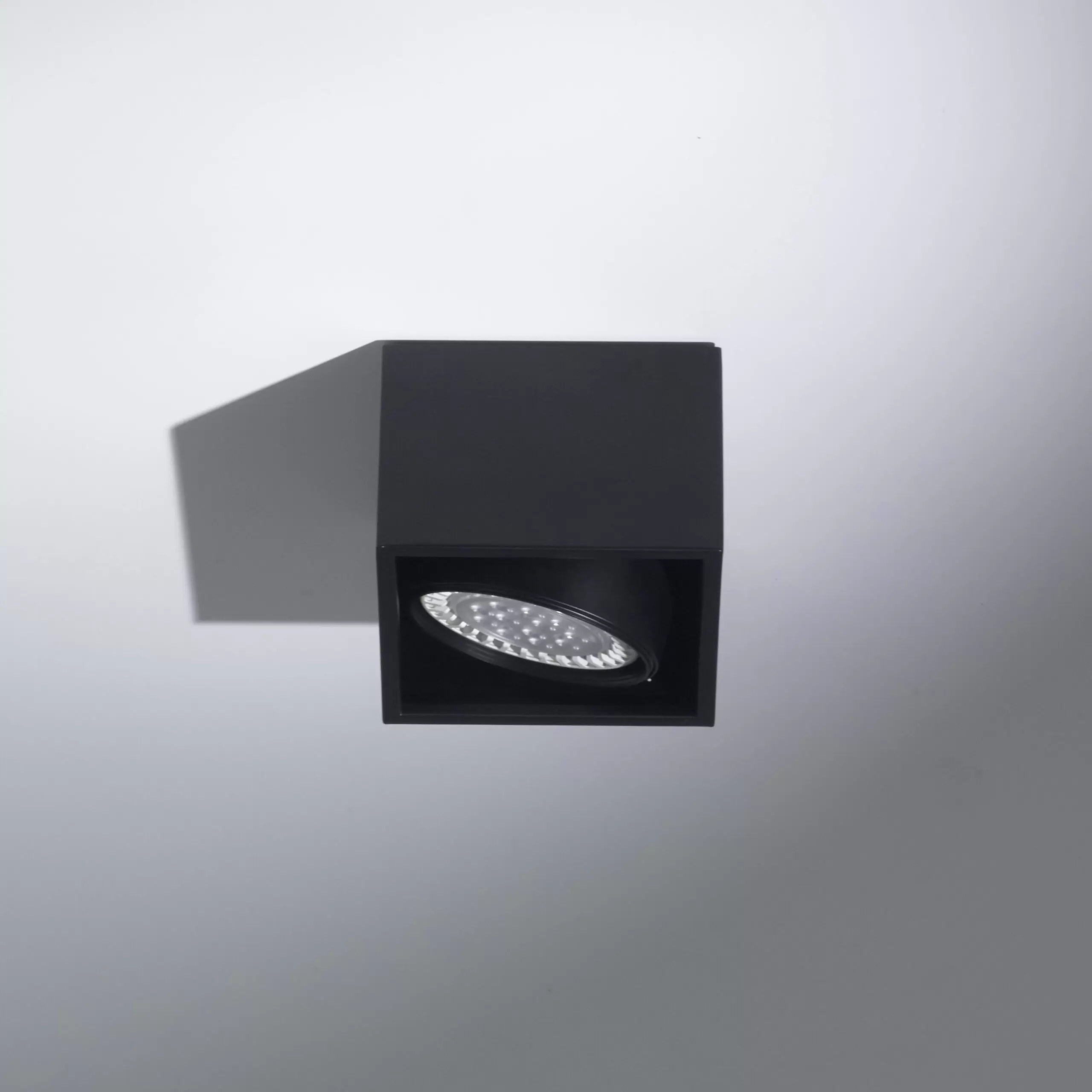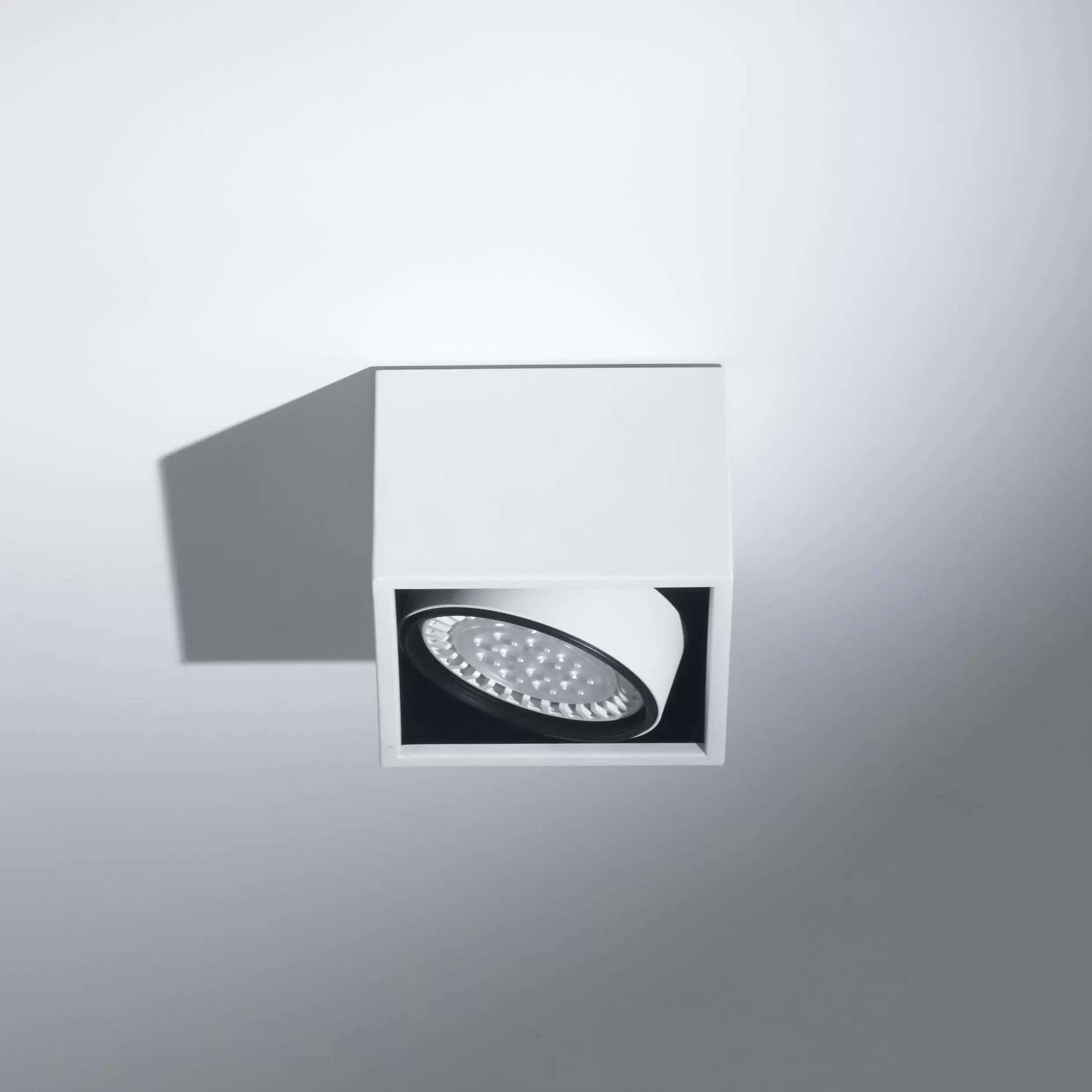 Plafón Berdy 1. Luminaria fabricada en metal de estilo moderno, con movimiento cardánico y disponible en dos colores: blanco o negro.