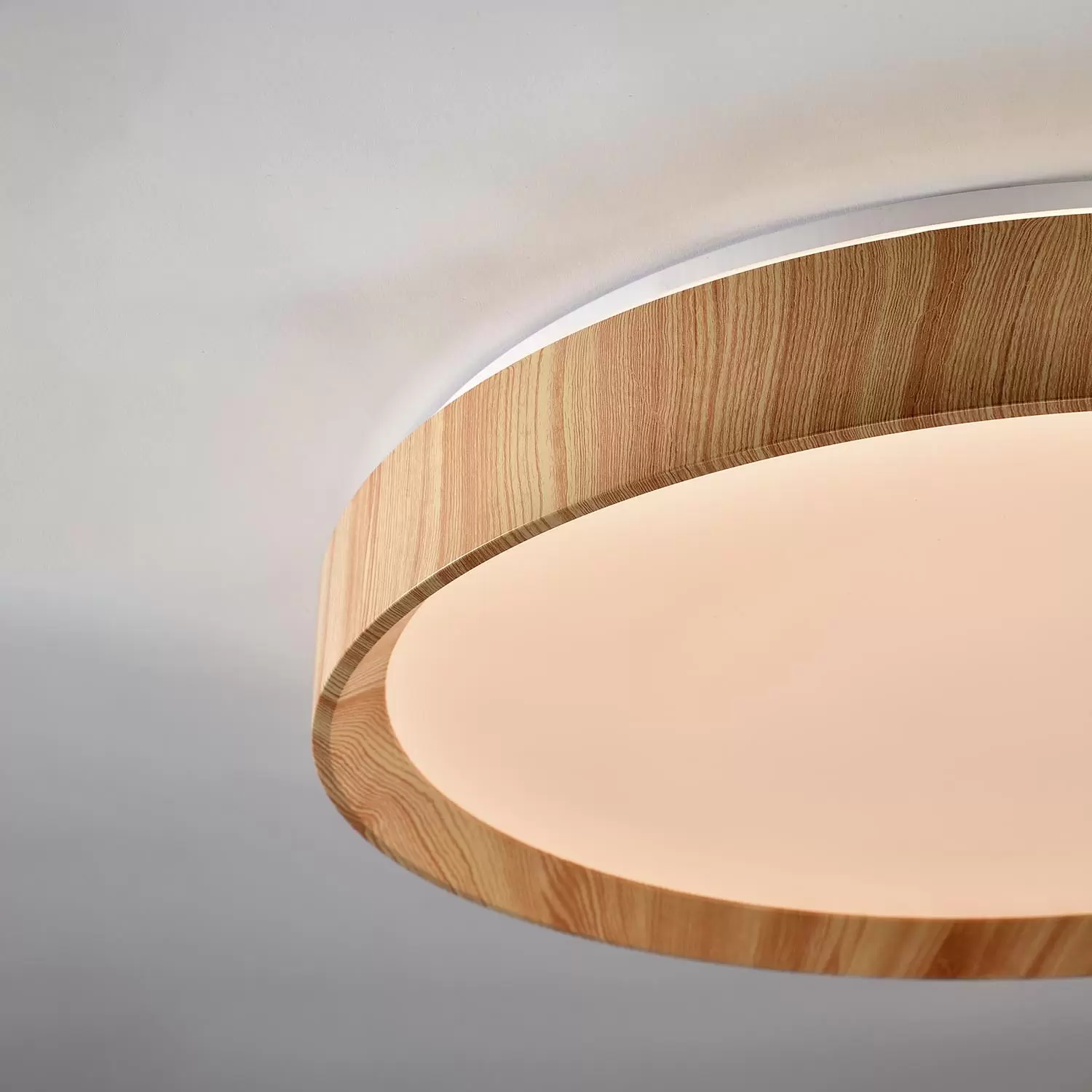 Plafón Bore. Luminaria de techo de estilo moderno, fabricada en metal, con LED cálido integrado y dimmerizable a control remoto. Disponible en color madera.