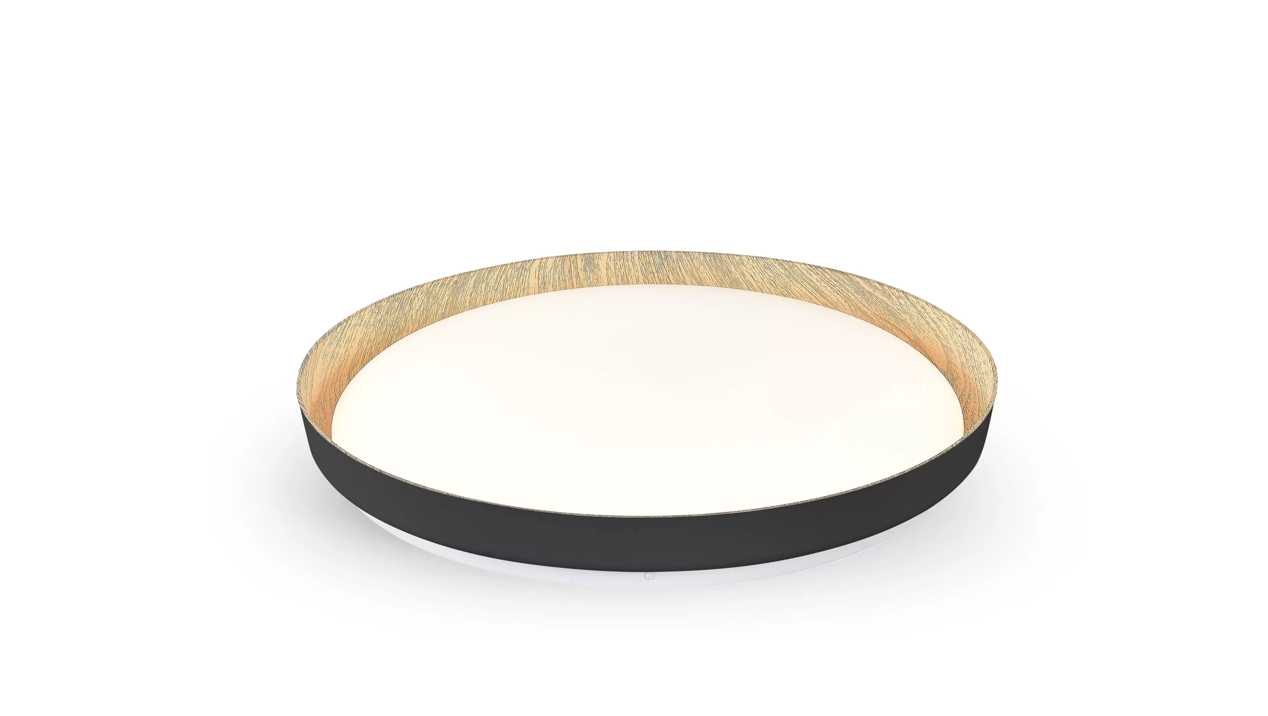 Plafon Chester. Luminaria de techo circular y de estilo moderno, fabricado en acero en color negro o blanco y detalles en madera y viene con LED integrado.