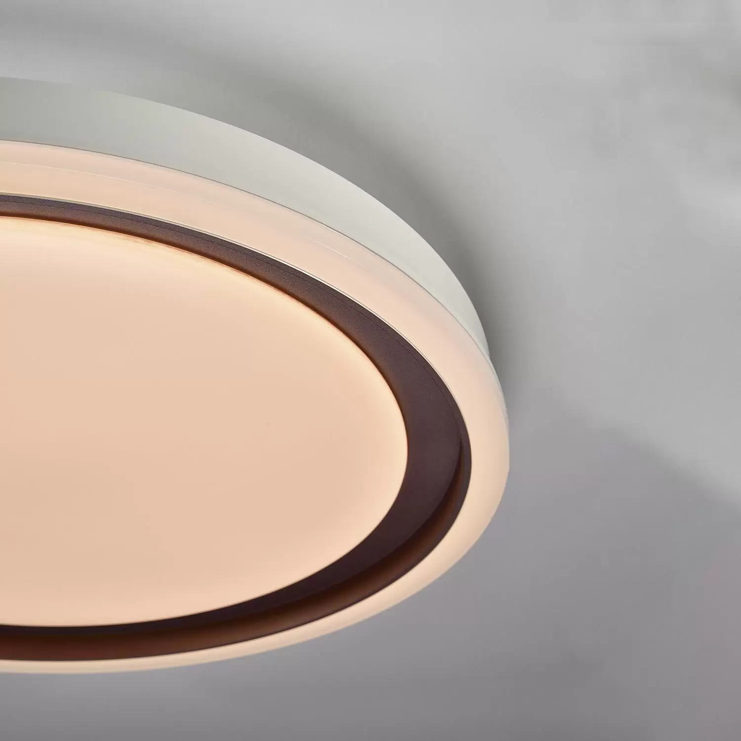 Plafón Done. Luminaria de techo de estilo moderno, con LED cálido integrado y dimmerizable a control remoto. Disponible en blanco con oro rosado y dos tamaños: S y L.