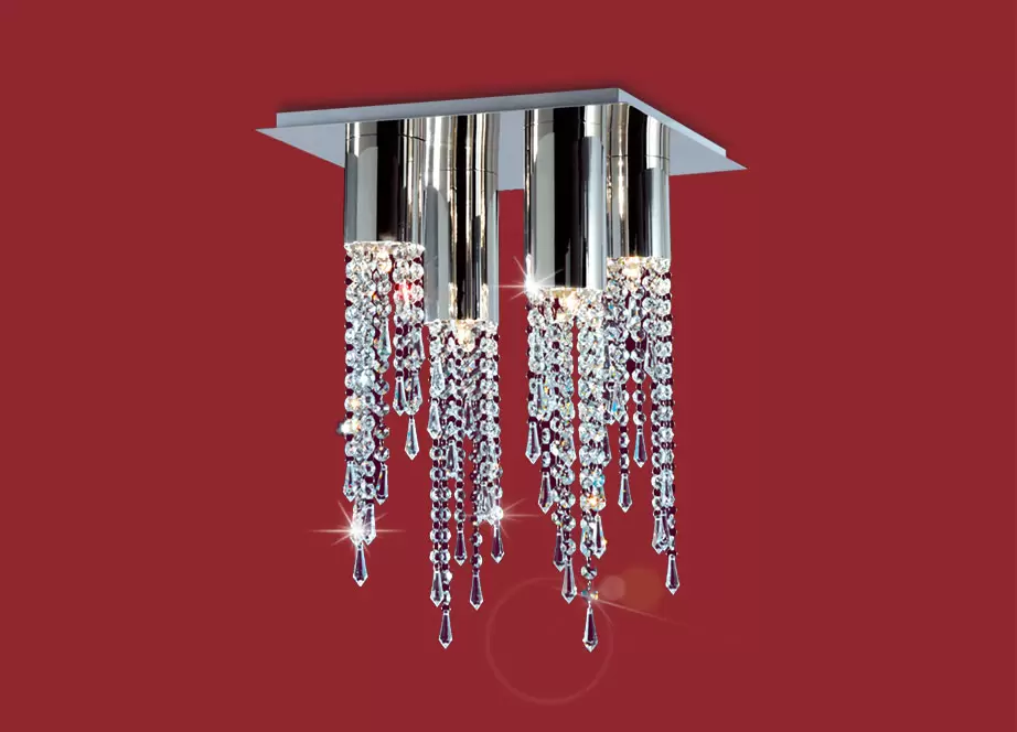 El plafón Viena es una lámpara de una o cuatro luces apto LED, disponible en color cromo con decoración de strass. Adaptable a todo tipo de ambiente.