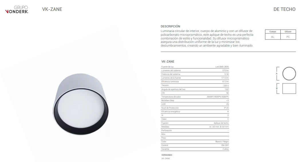 Plafon Zane. Luminaria de techo circular, de estilo minimalista fabricado en aluminio y con difusor de policarbonato microprismático con interruptor ON/OFF.