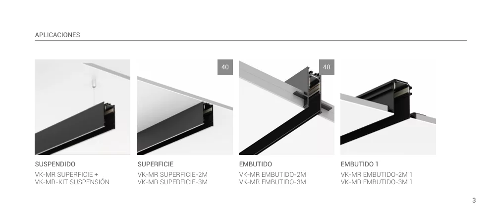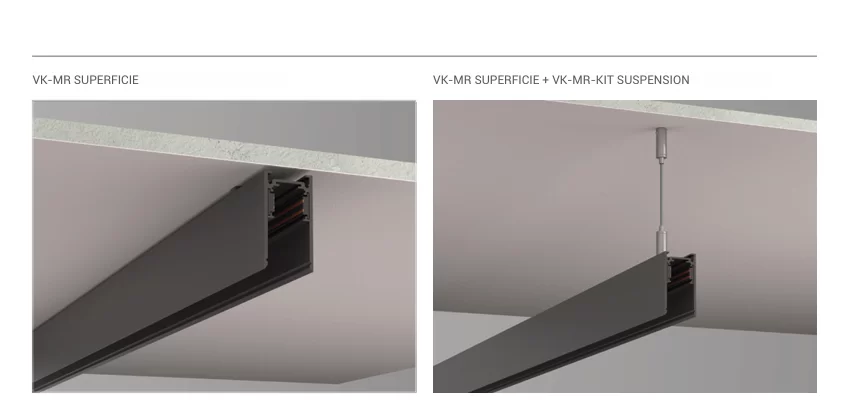 El riel superficie es para aplicar a techo (con agregado de kit de fijación) o para suspender (con agregado del kit suspensión). CONSULTAR.