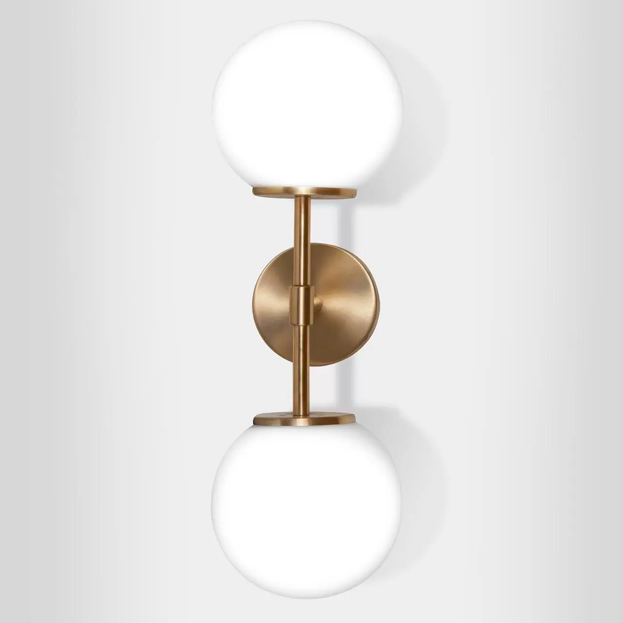 Aplique de pared para dos luces apto LED. Fabricando en metal con tulipas de vidrio blanco opal de 15 o 18cm de diámetro. Disponible en color cromo, negro u oro.